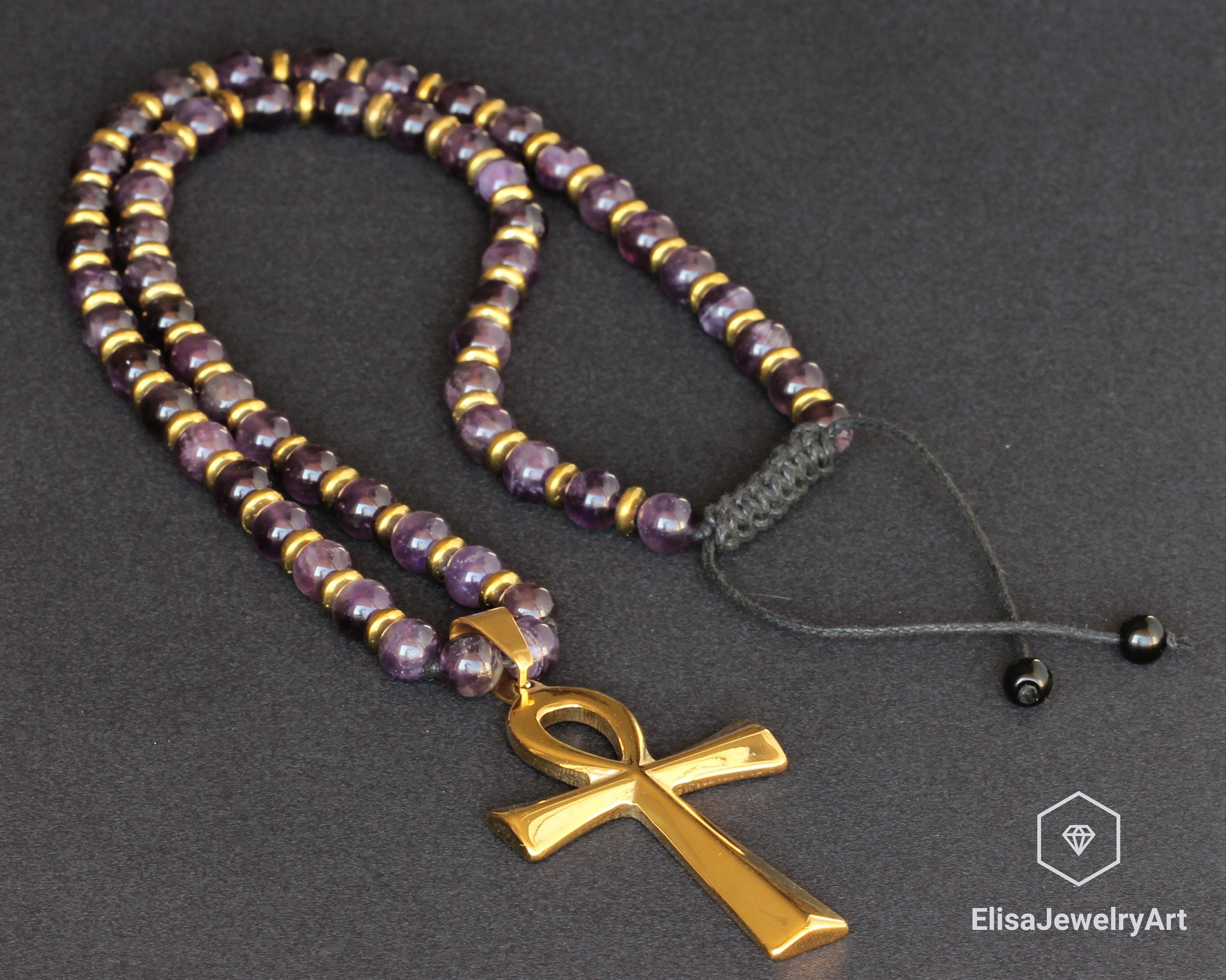 Donna Ankh Cross & Natural Amethyst Gemstone Protection Beaded ...