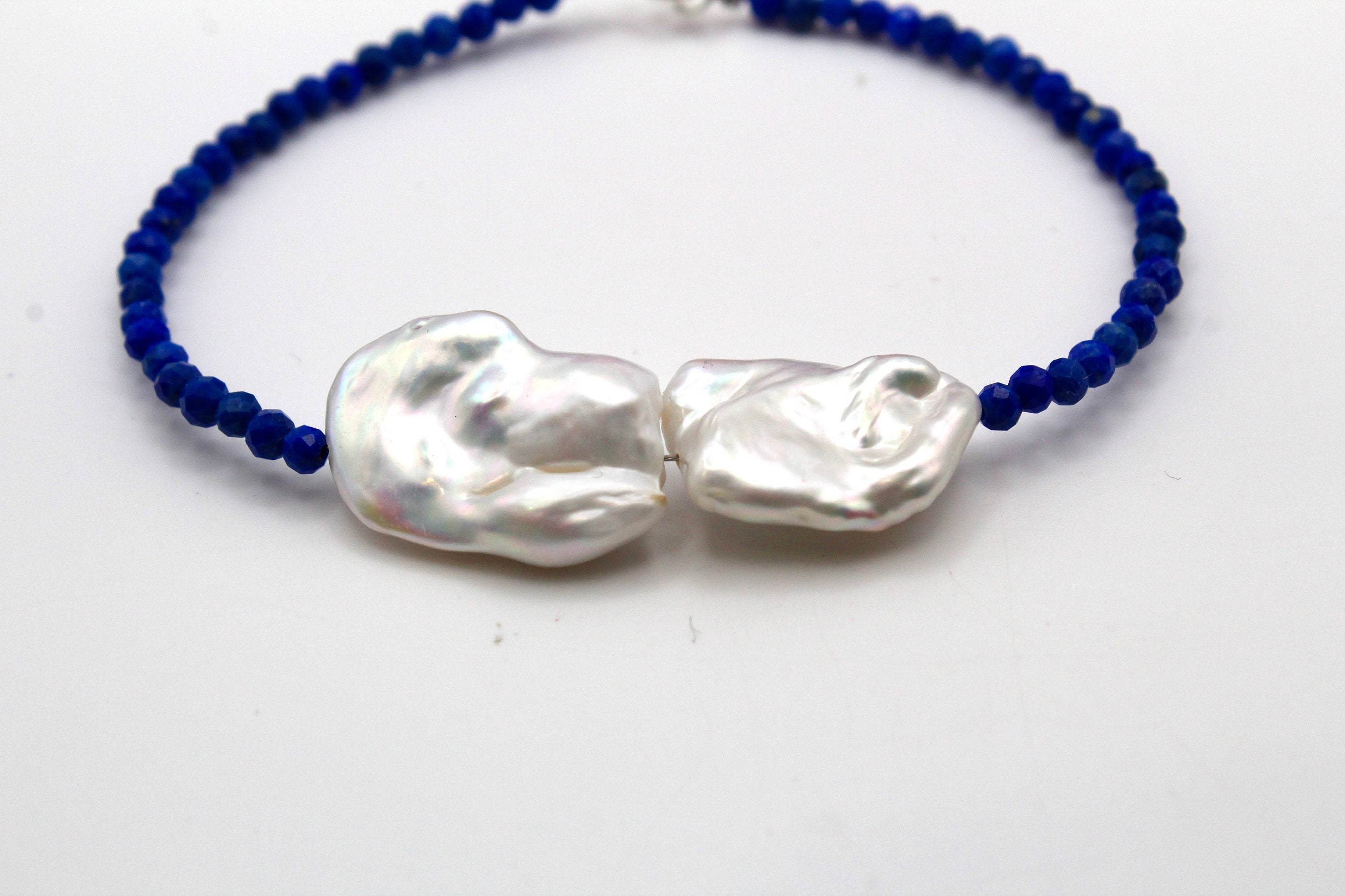 Pearl& lapis bracelet, pearl, natural freshwater pearl, Sterlin...