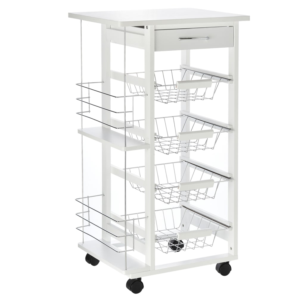 Carrello da cucina in legno bianco cassetto 4 cestelli e ruote