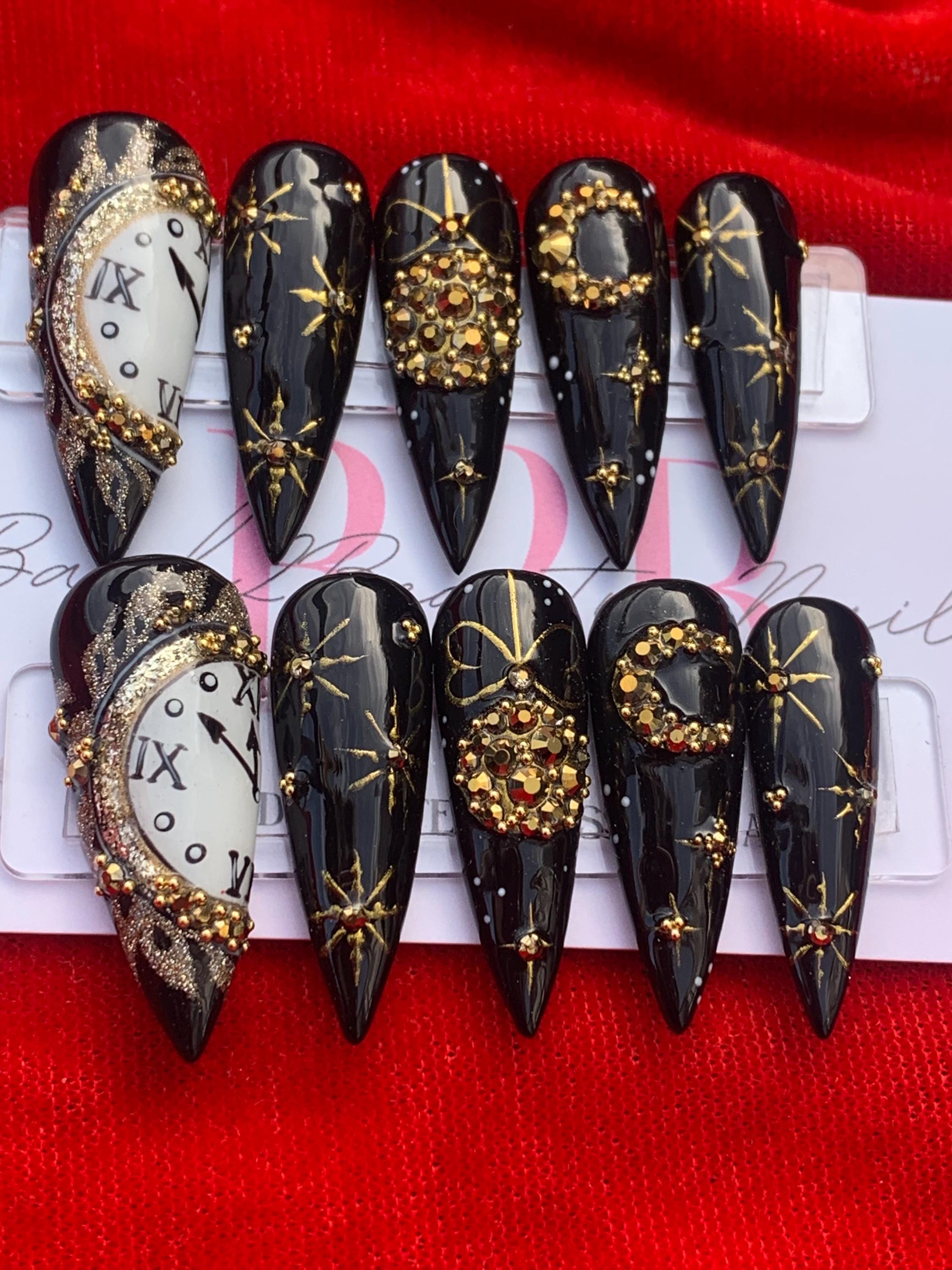 Unghie di Capodanno nere e dorate/Unghie press on scintillanti/Ungh...