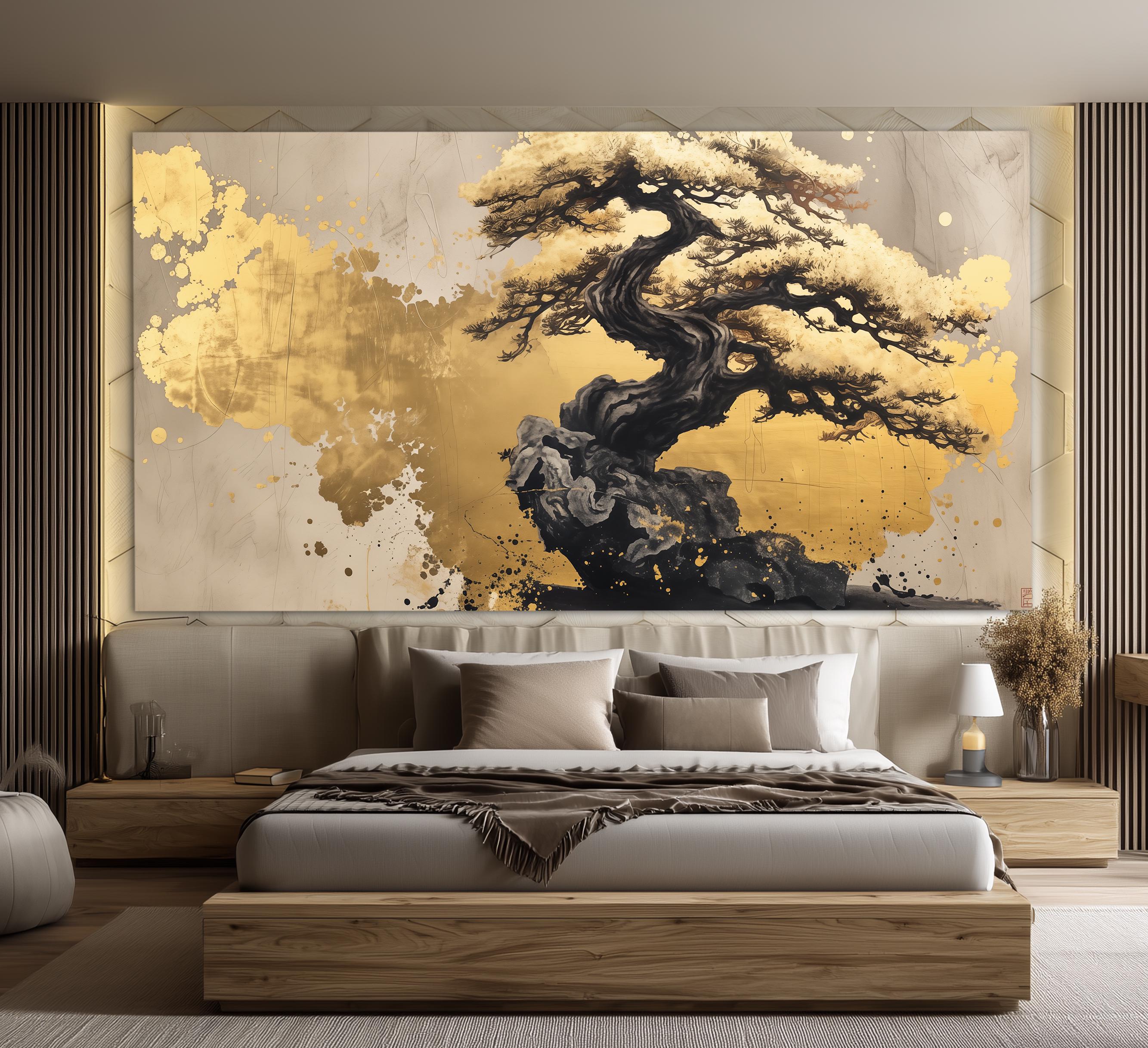 Stampa su tela di bonsai astratto, dipinto di albero dorato, decora...