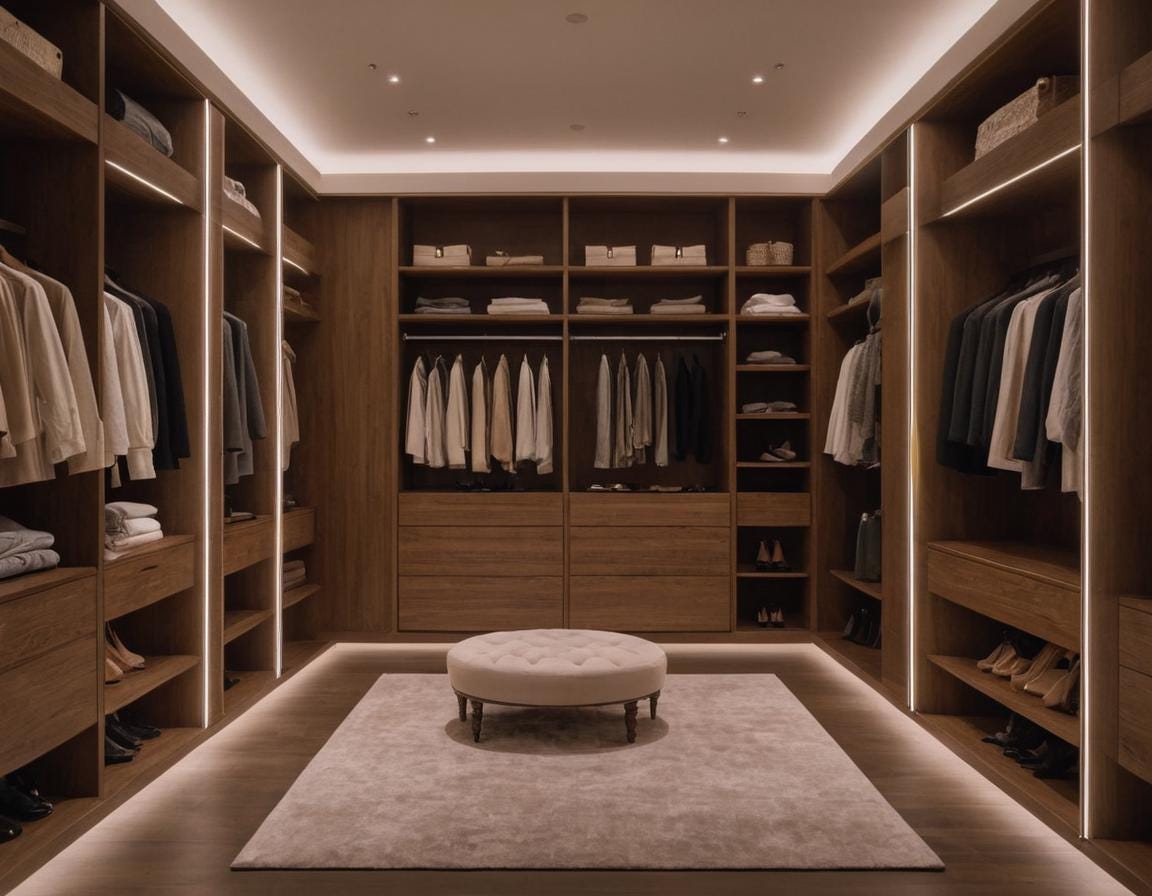 Progetto di una cabina armadio elegante e lussuosa sui toni del bei...