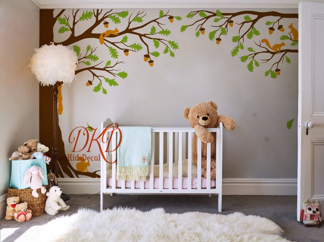 Nursery Wall Decal Wall Sticker-Corner Tree Wall Decal-Tree with squirrel, Top Tree, Pine cones, Kid...