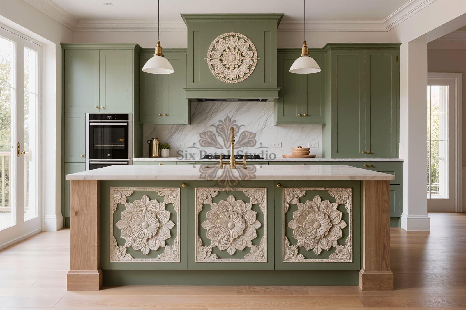 Isola da cucina floreale intagliata a mano, isola in stile fattoria...