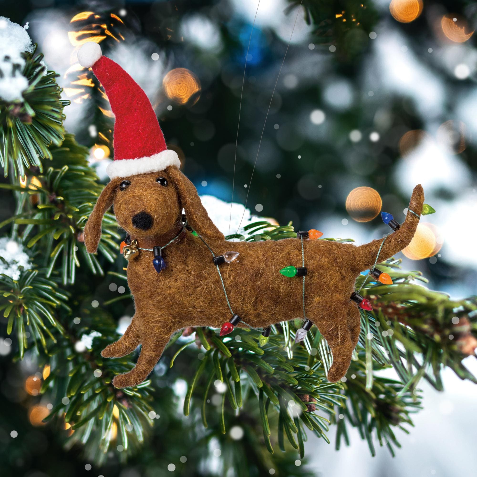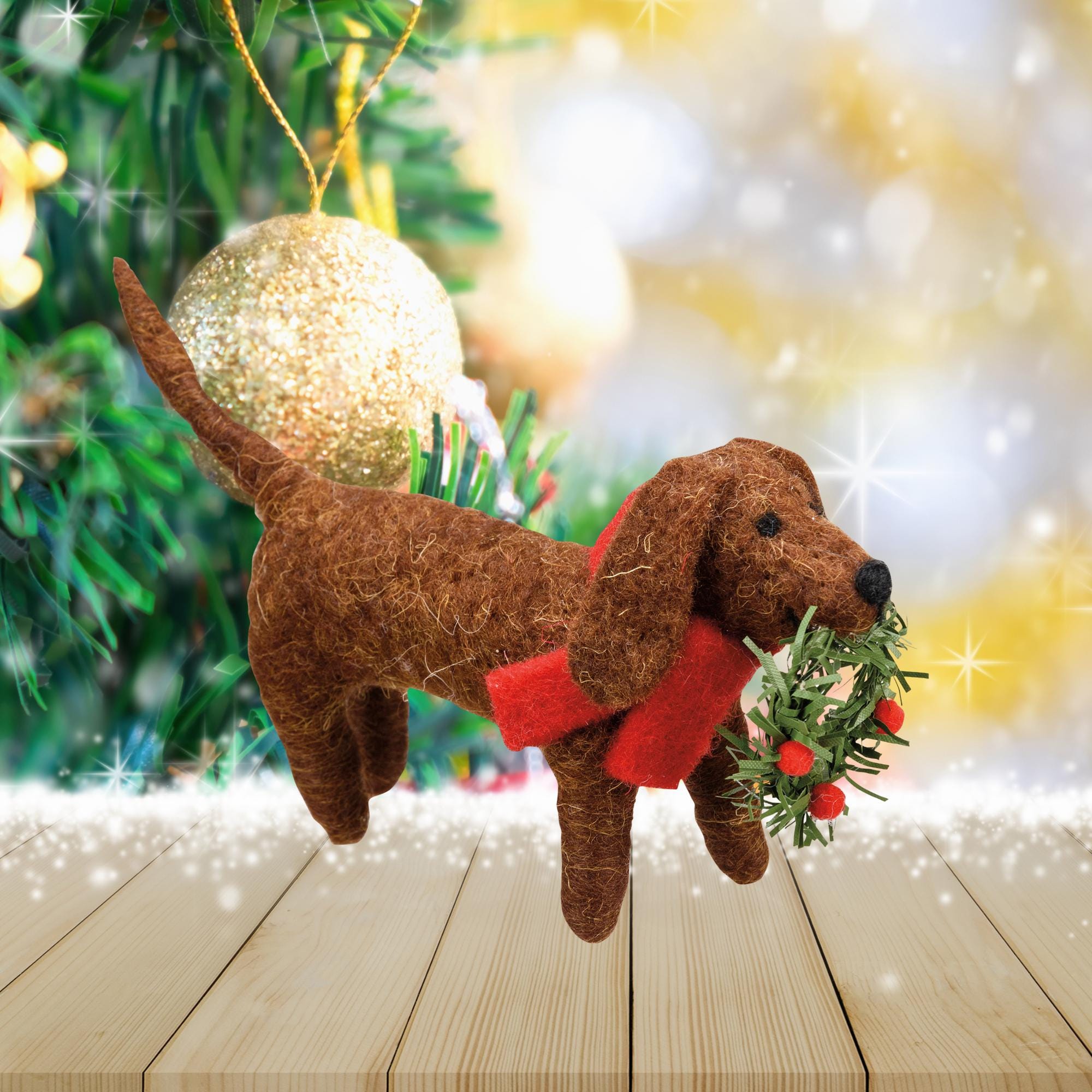 "Un'adorabile decorazione in feltro raffigurante un adorabile bassotto avvolto in colorate luci...