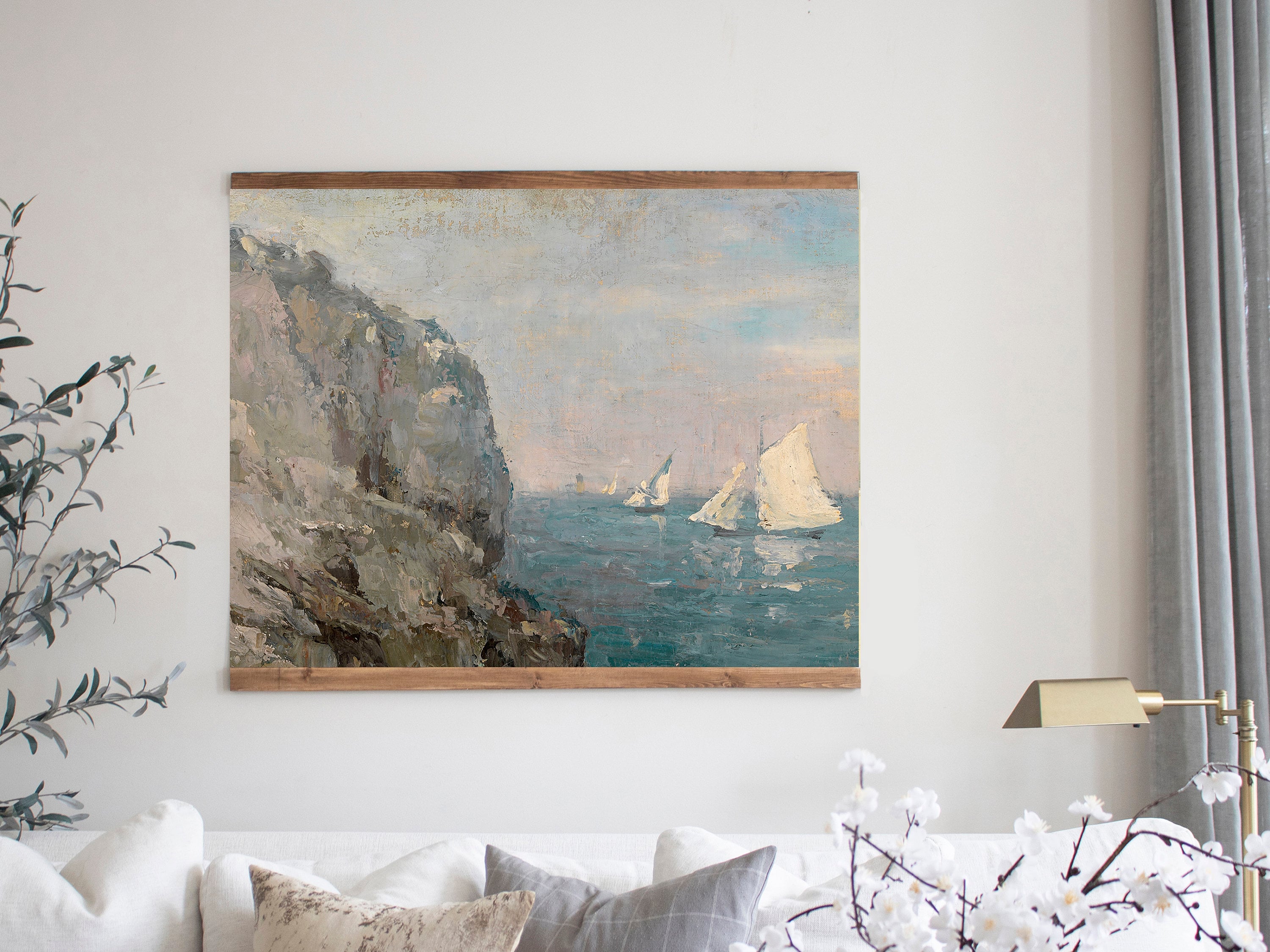 Coastal Vintage Oil Painting-Barche di Cliffside nei toni del blu. I nostri splendidi TAPESTRIES con...