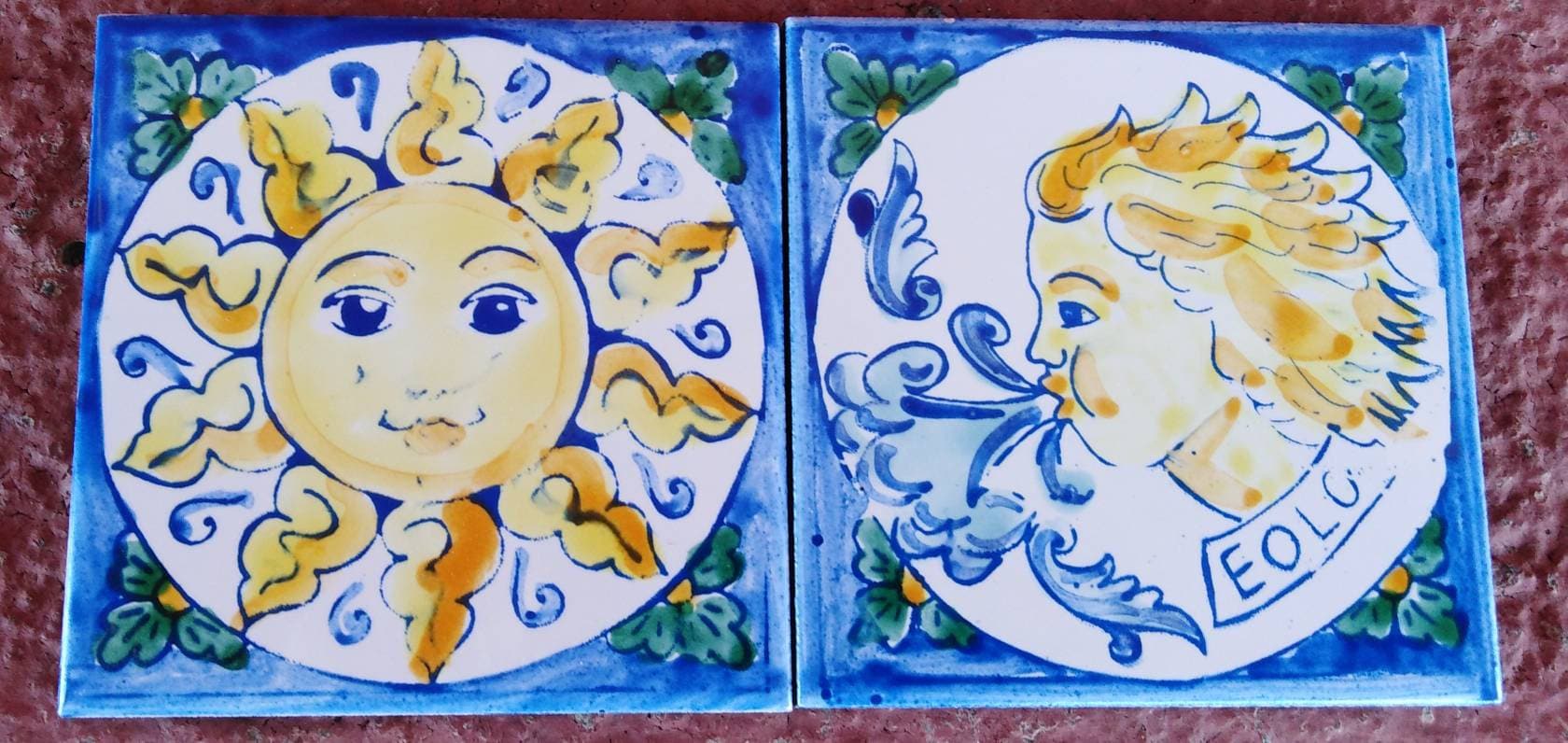 Composizione di 4 piastrelle. 2 con decoro Sole 2 con decoro Eolo(Dio del vento). Composizione di 4 ...