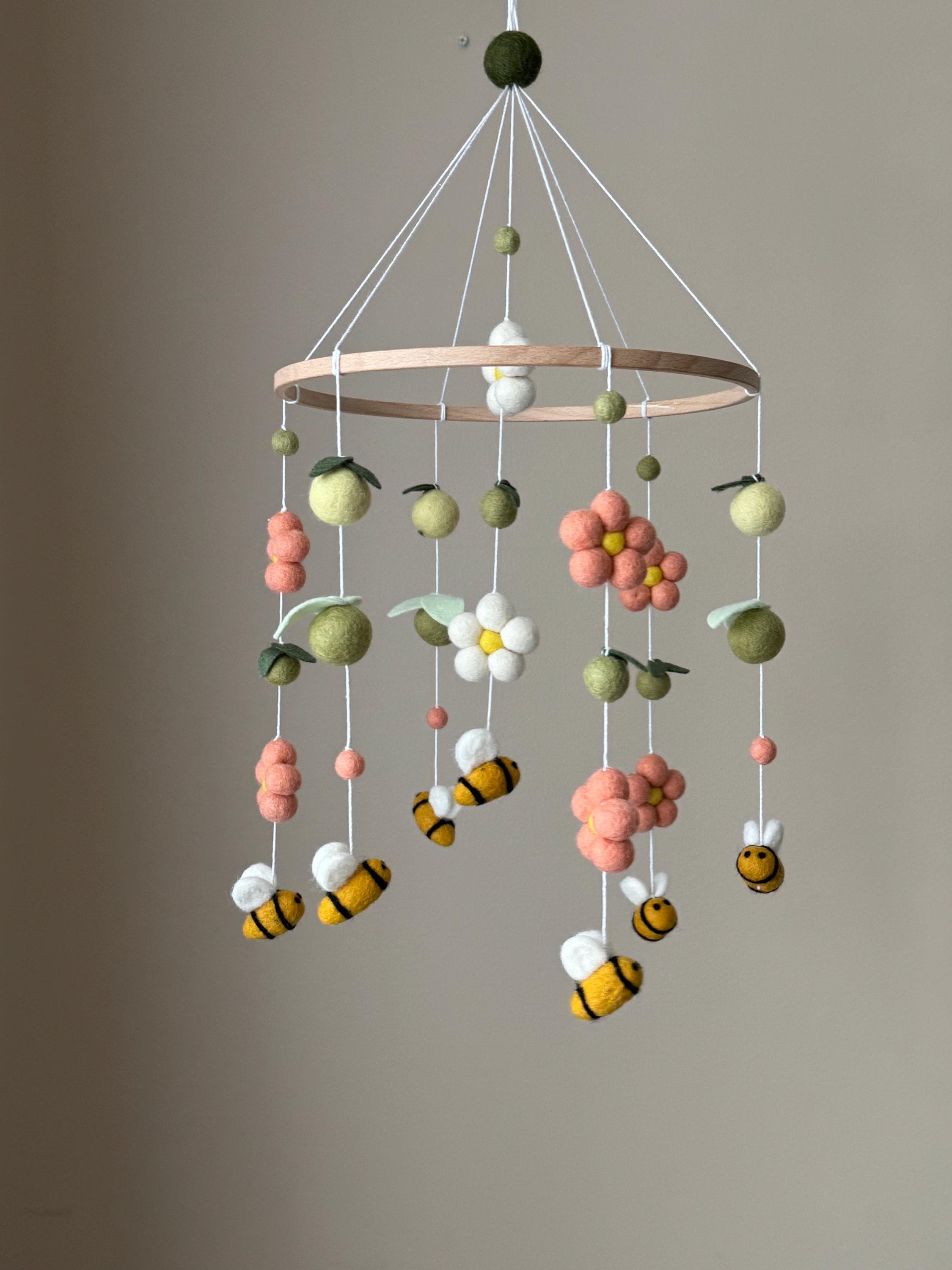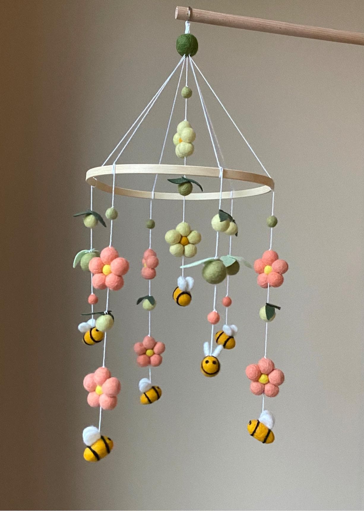 Il mobile a forma di margherita con ape, palla di feltro, fiori e pesche è ideale come decora...