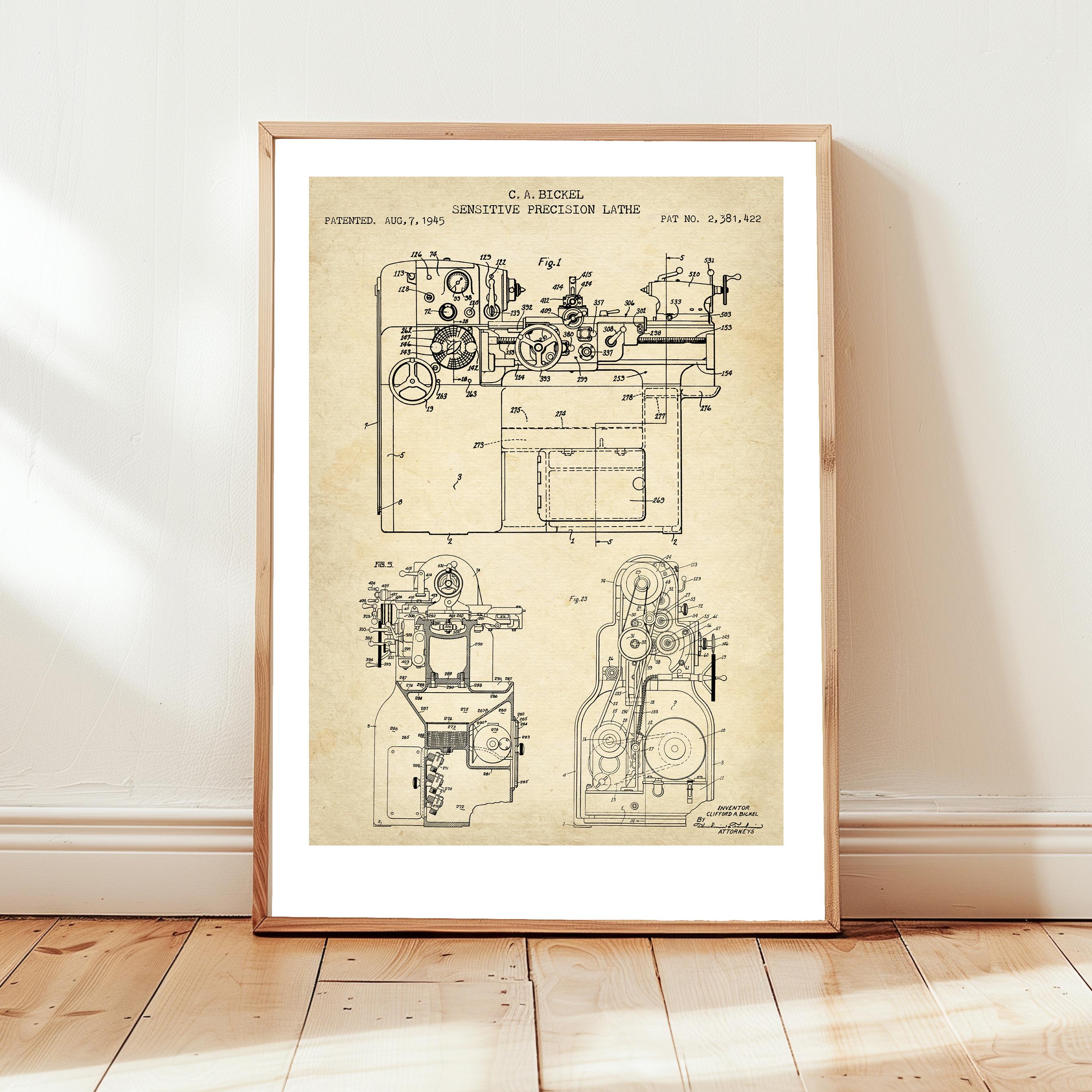 Fresatrice Bridgeport, brevetto per tornio, poster con progetto, ga...