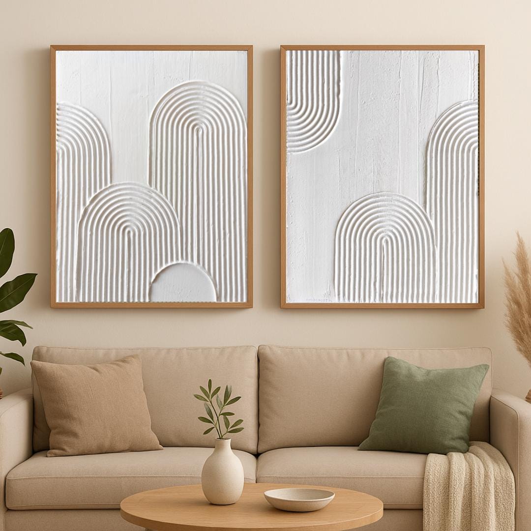Scopri la bellezza dell'arte murale materica con questo elegante dittico minimalista bianco, realizz...