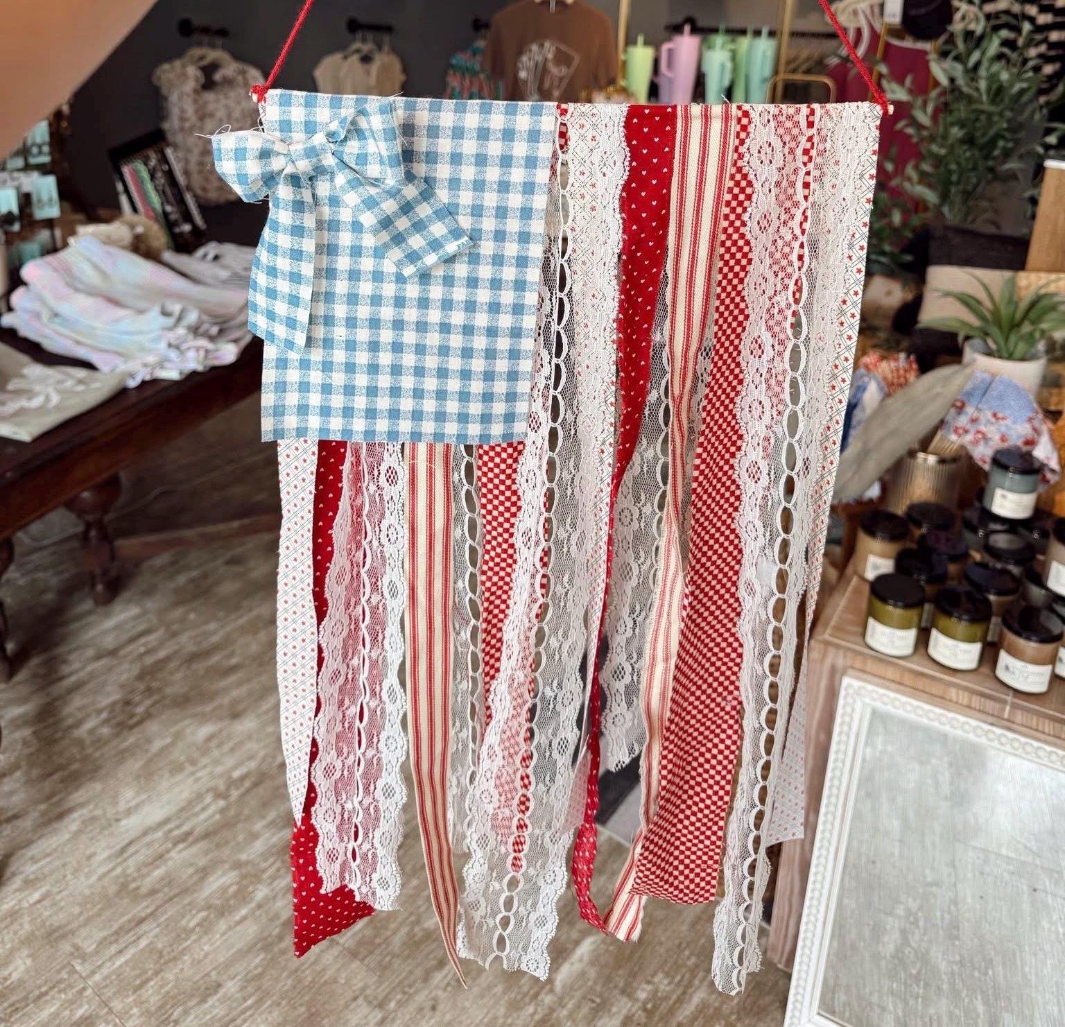 "Bandiera americana in tessuto, bandiera americana di stracci, bandiera americana con nastro, d...