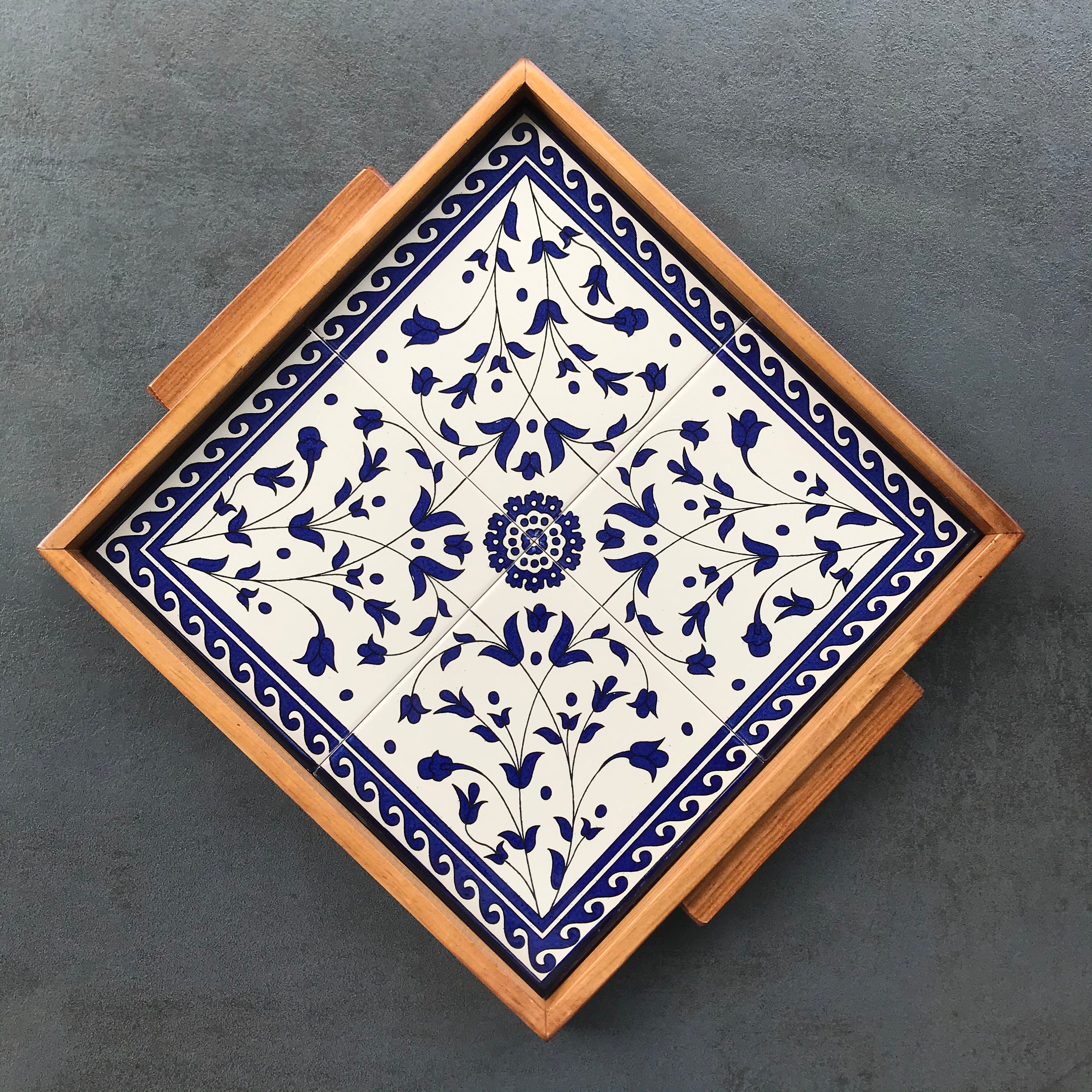 Questo vassoio in legno, sapientemente lavorato, è impreziosito da piastrelle in ceramica. &E...