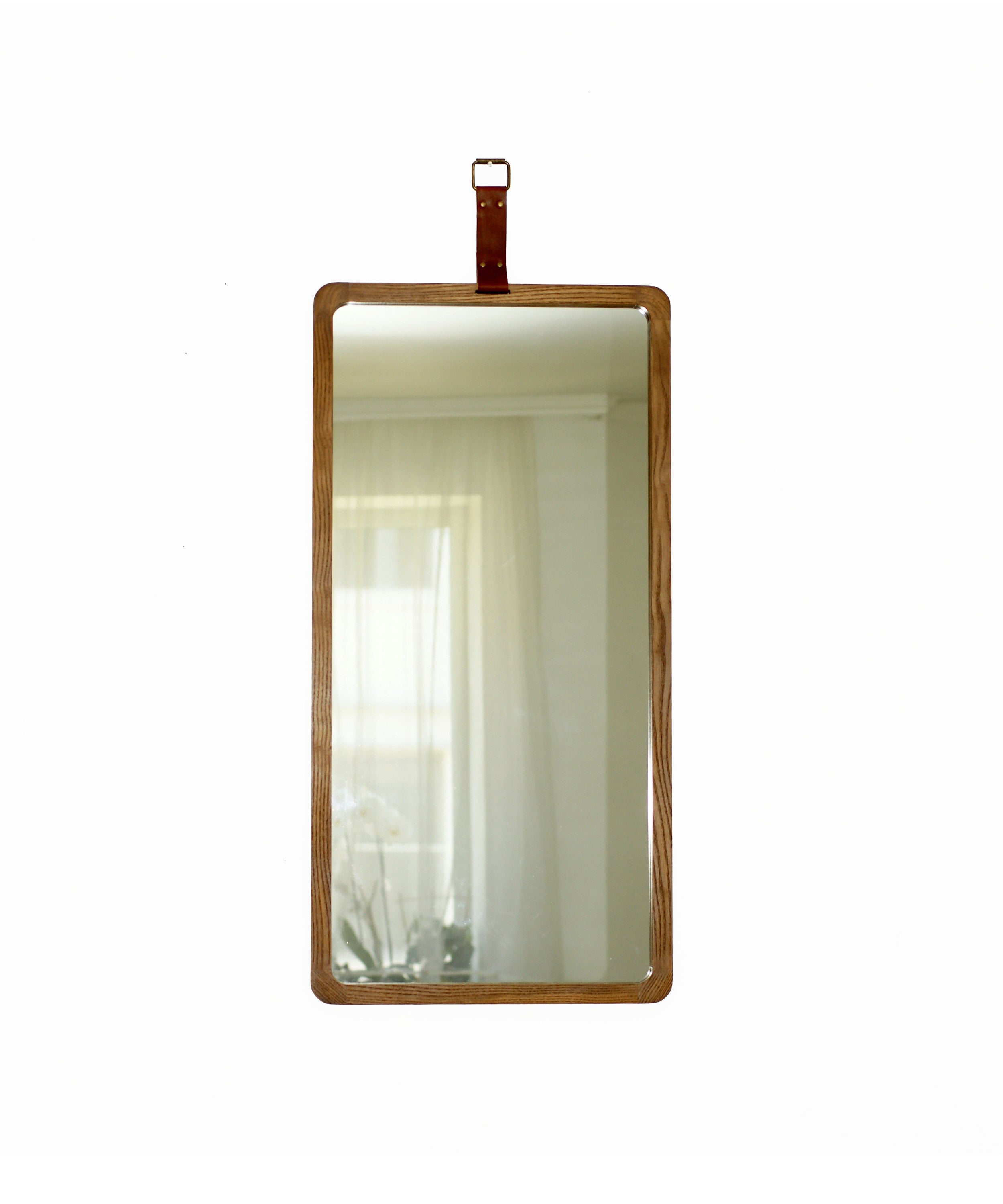 "* Grande specchio moderno con cornice in legno e cinturino in vera pelle marrone. La cornice d...