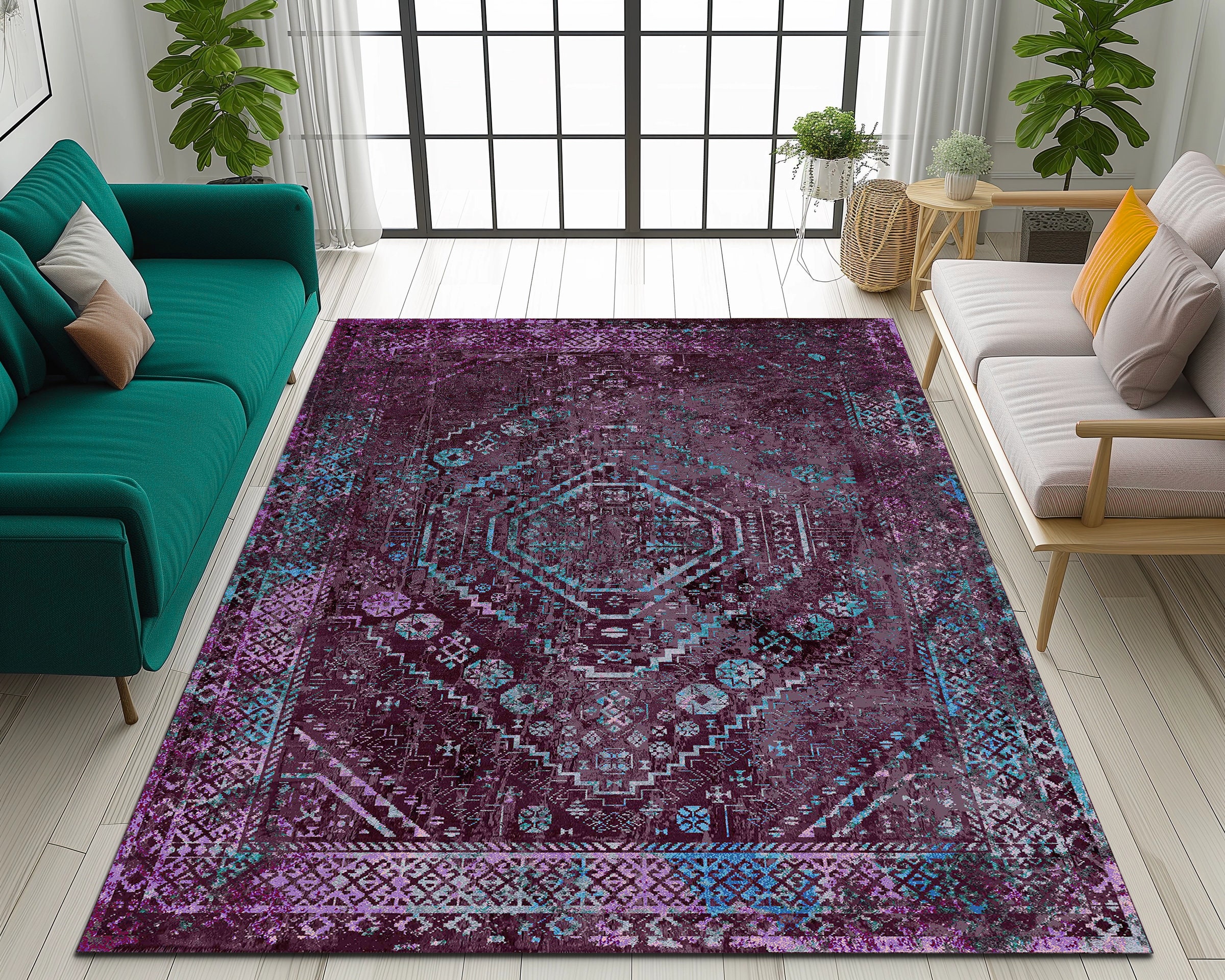 Tappeto viola, tappeto tradizionale, tappeto anticato, tappeto ikat, tappeto rustico, tappeto digita...