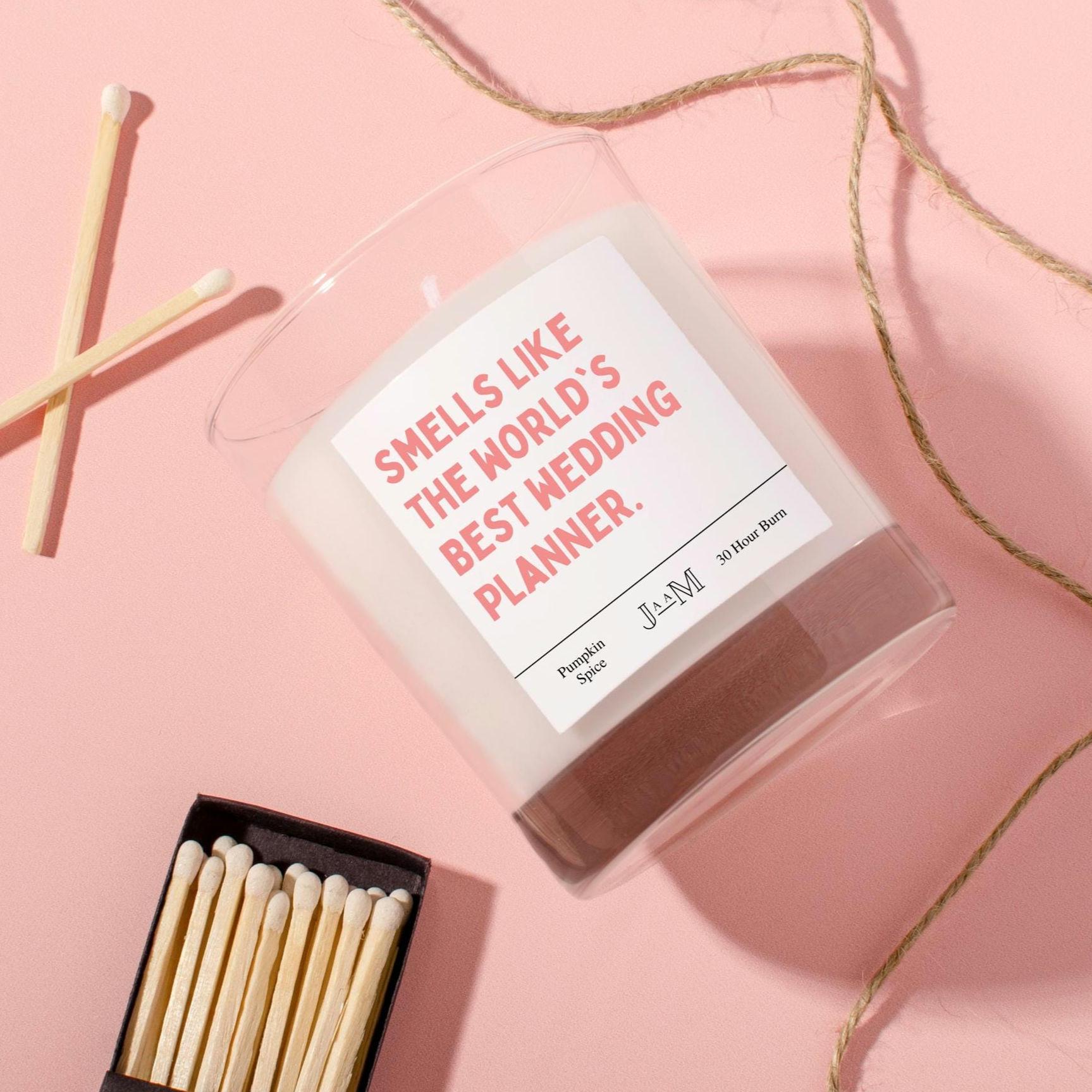 "Un regalo fantastico per un wedding planner Sulla candela è scritto \"profuma come...