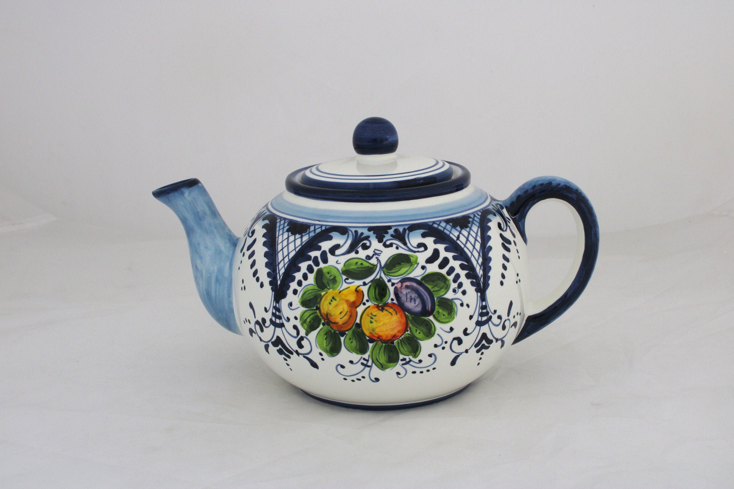 Italian Ceramic Teapot Fruttina Pattern with Blue Border, Hand Pain...