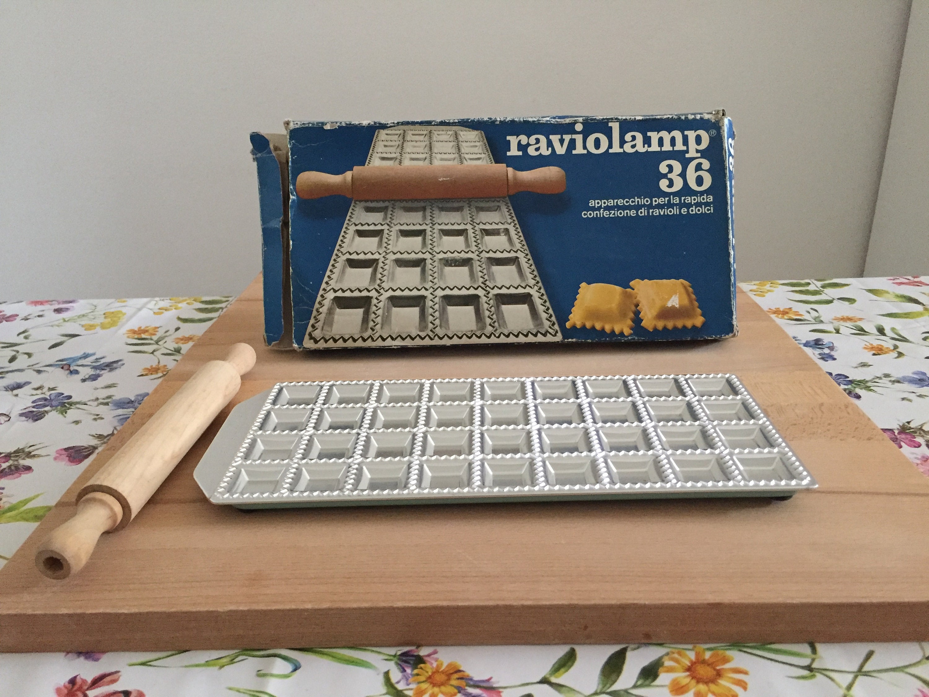 "Attrezzo in alluminio per fare 36 ravioli in un lampo, corredato di mattarello. Il mattarello ...