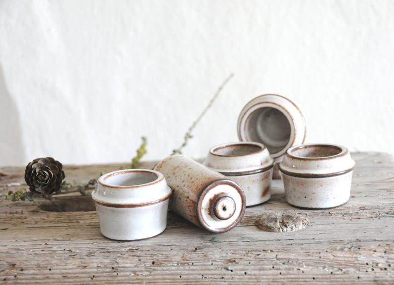 Set di quattro portauova e uno shaker. Stogo, gres porcellanato moderno danese. Design di Herluf Got...