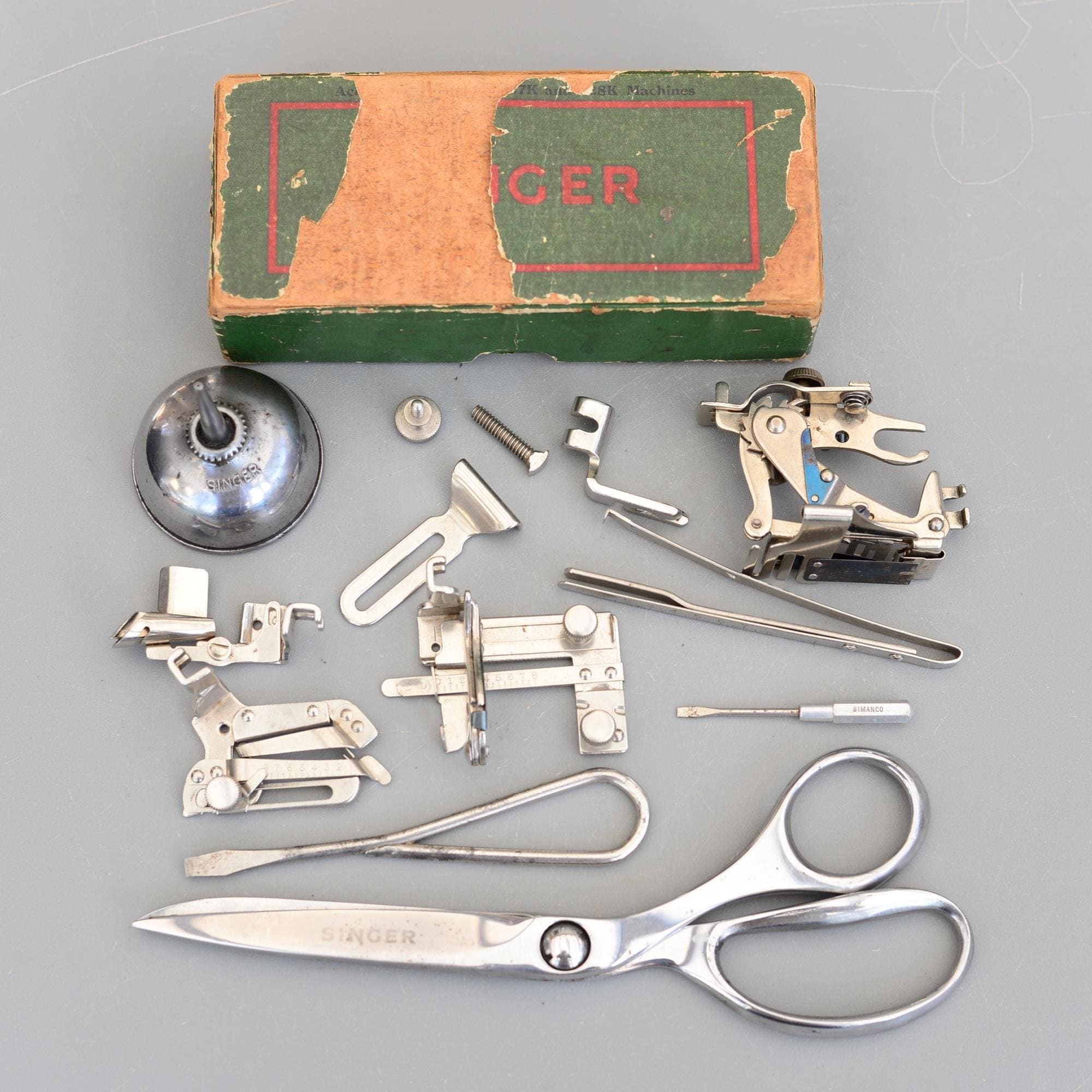 Scatola di accessori per macchina da cucire Singer Simanco d'epoca, lattina di olio, forbici, caccia...