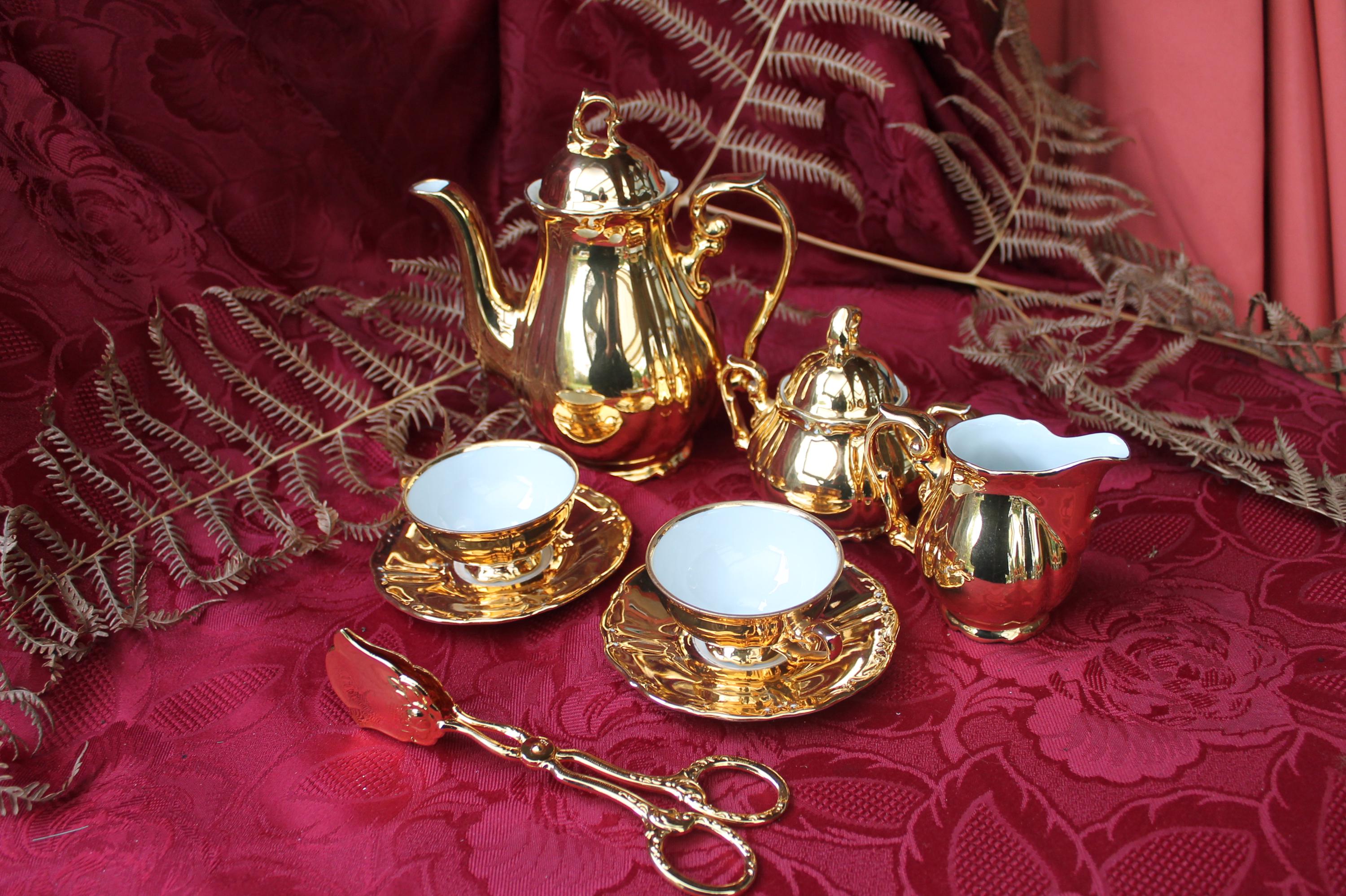 Servizio da moka dorato di Schlottenhof: 2 tazze con piattini, bricco, lattiera e zuccheriera, e una...