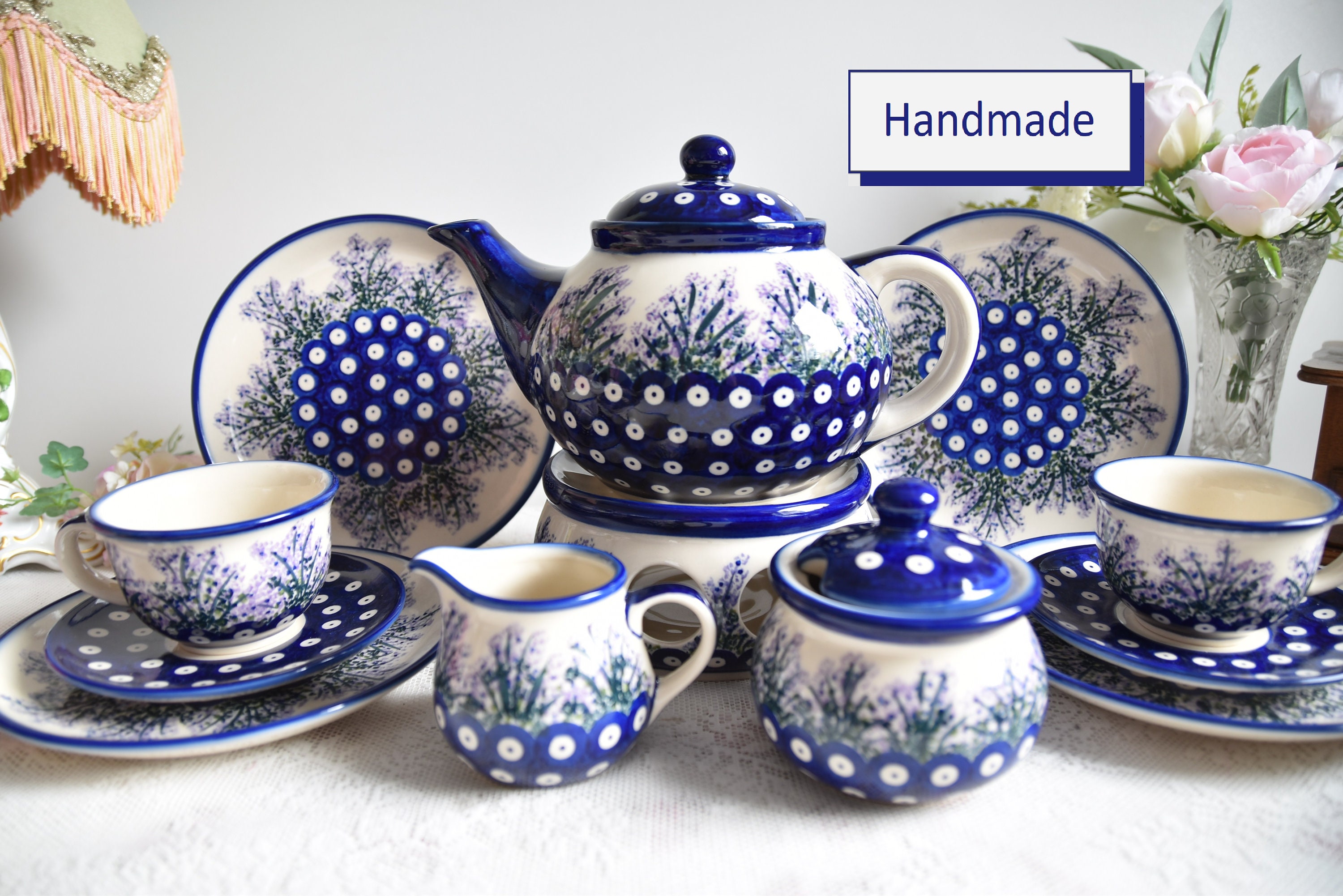 "Set di stoviglie in gres fatto a mano da Boleslawiec. Set da tè Boleslawiec dipinto a m...