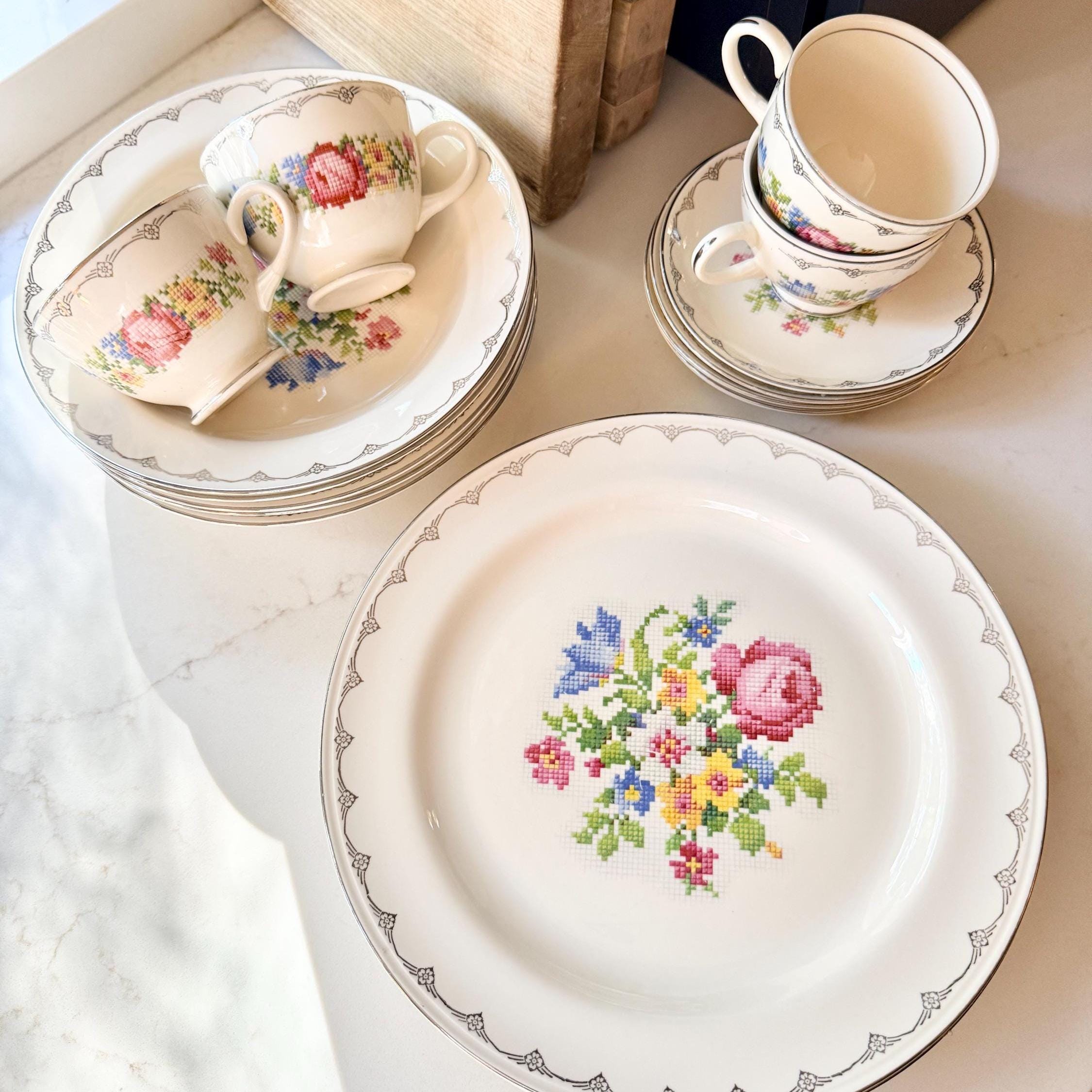 Piatti in porcellana Royal Albert Crown con ricamo a punto croce. S...