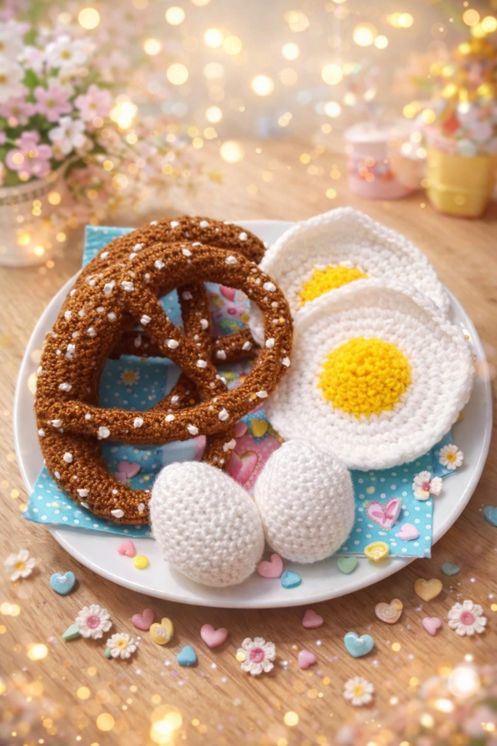 Colazione all'uncinetto con pretzel e uova per la cucina dei bambin...
