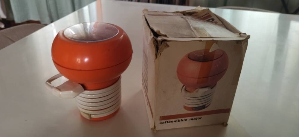 Macinacaffè elettrico, perfettamente funzionante. Stile Space Age, arancione vintage. Con sca...