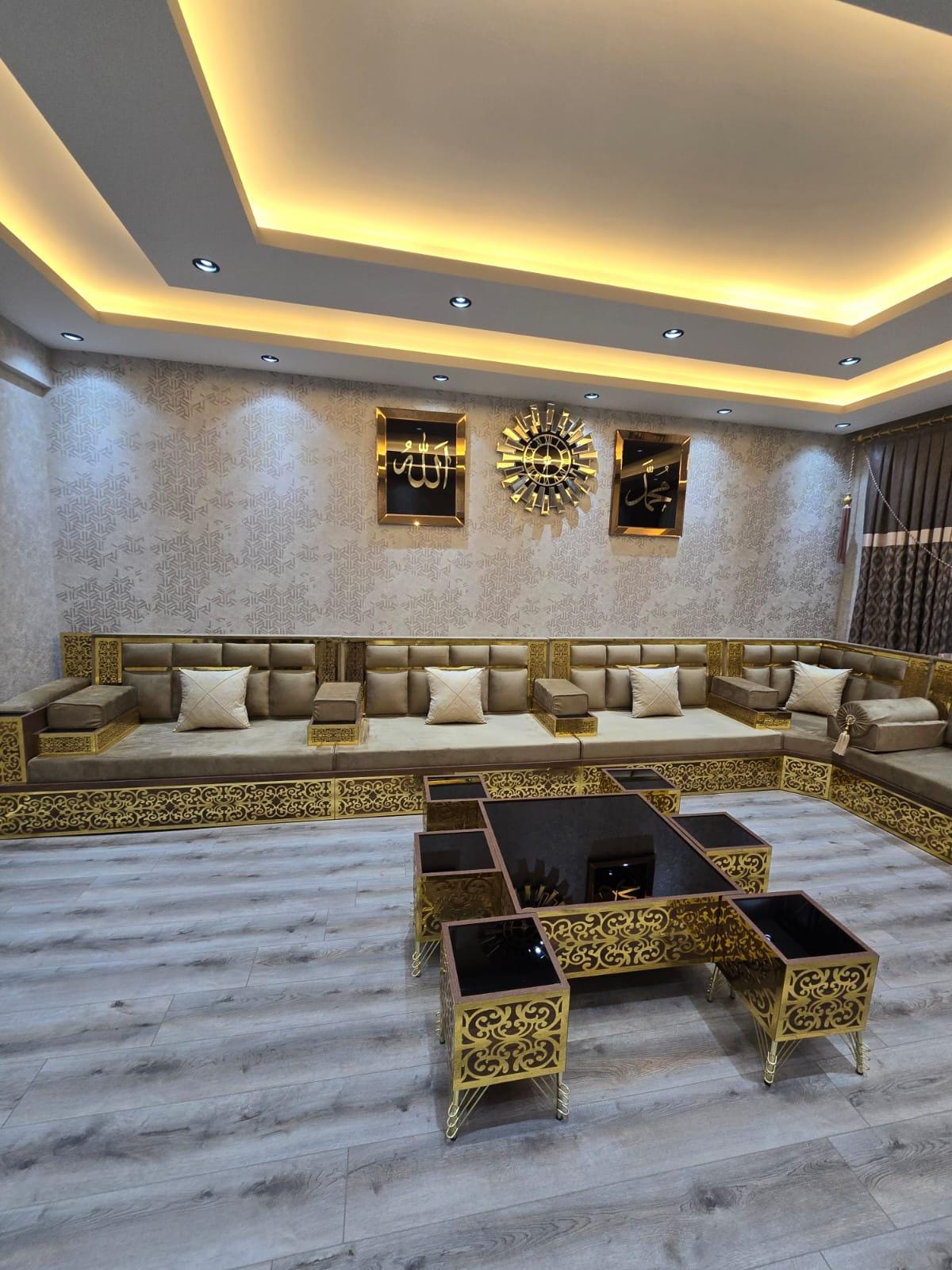 Set di divani Majlis beige e oro, seduta da pavimento araba a forma...