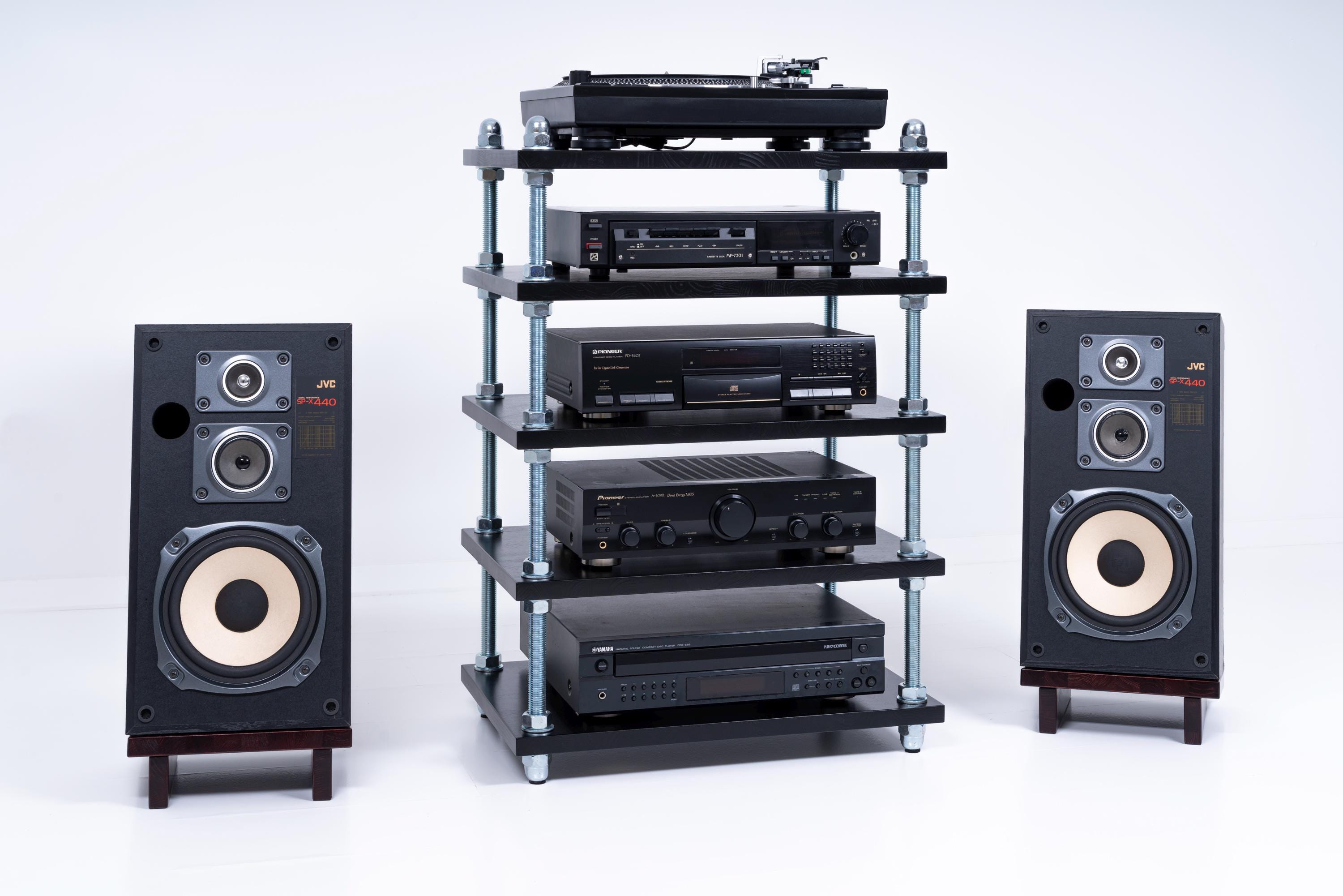 "Rack audio dal design industriale realizzato in legno listellare e barre filettate e dadi di g...