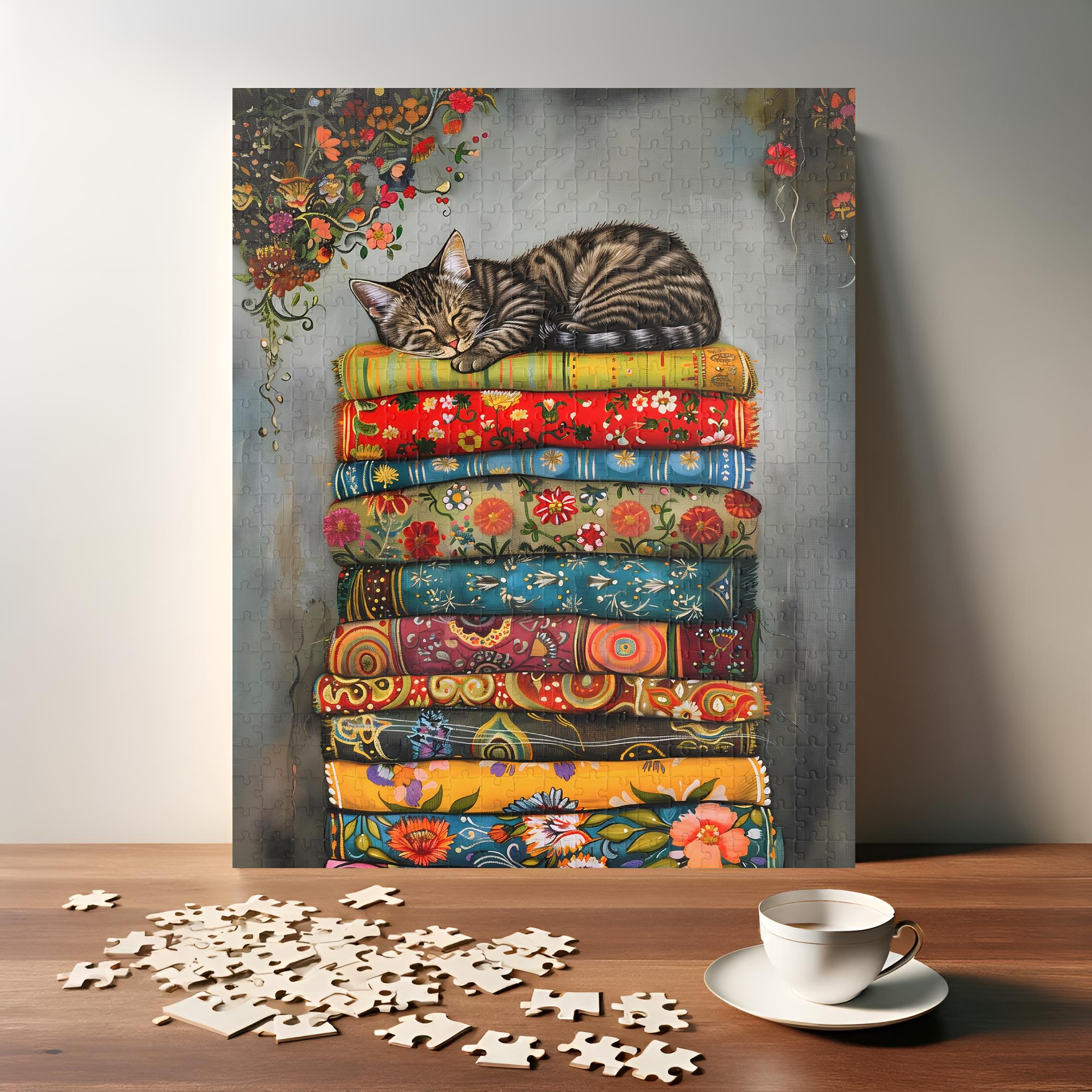 Puzzle Cozy Cat Nap - Gattino soriano su tessuto colorato - Regalo ...