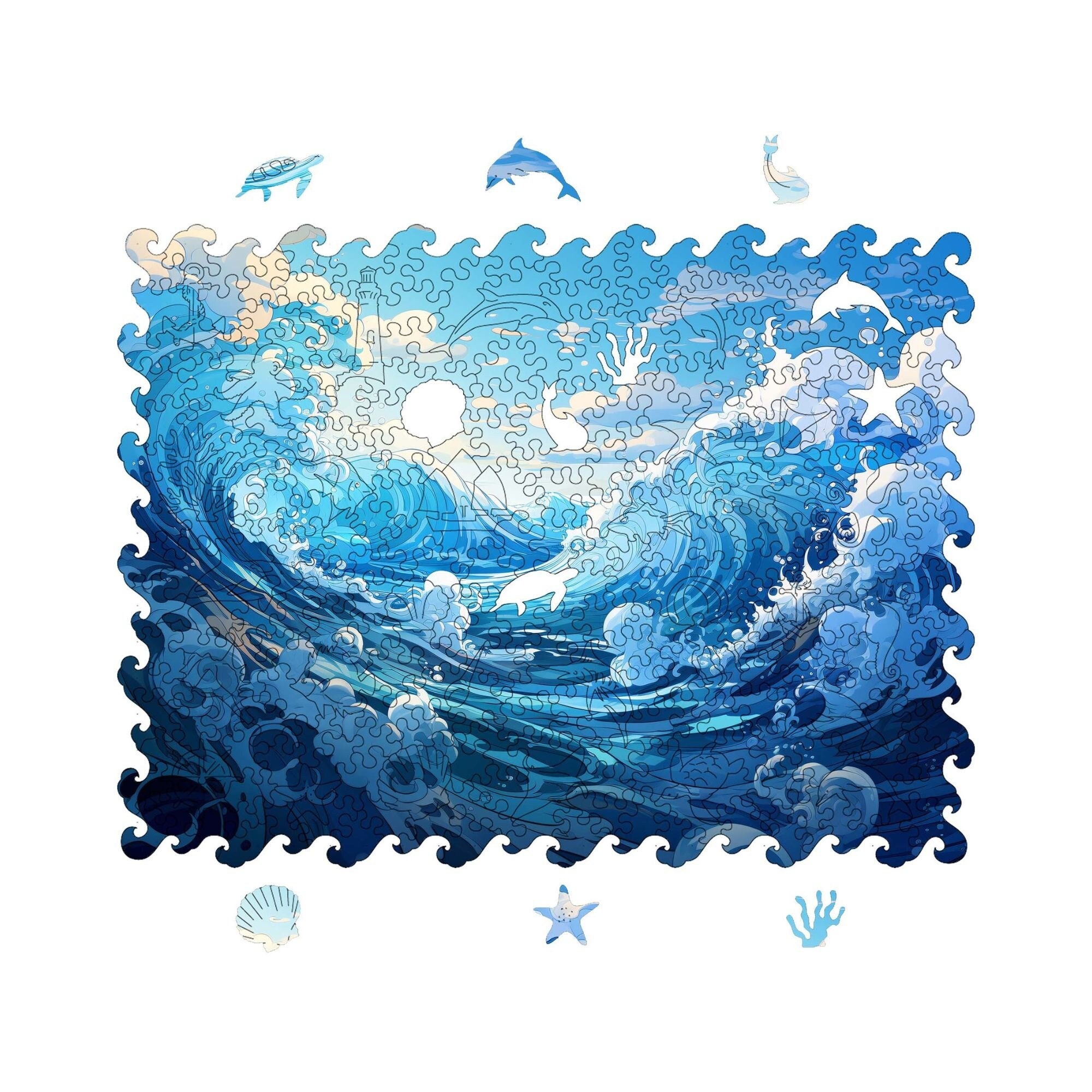 Immergiti nell'incantevole mondo di questo puzzle in legno raffigurante l'oceano blu, un puzzle unic...