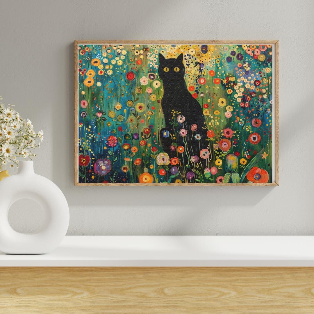 Puzzle di gatto nero con fiori, puzzle artistico di gatto, arte col...