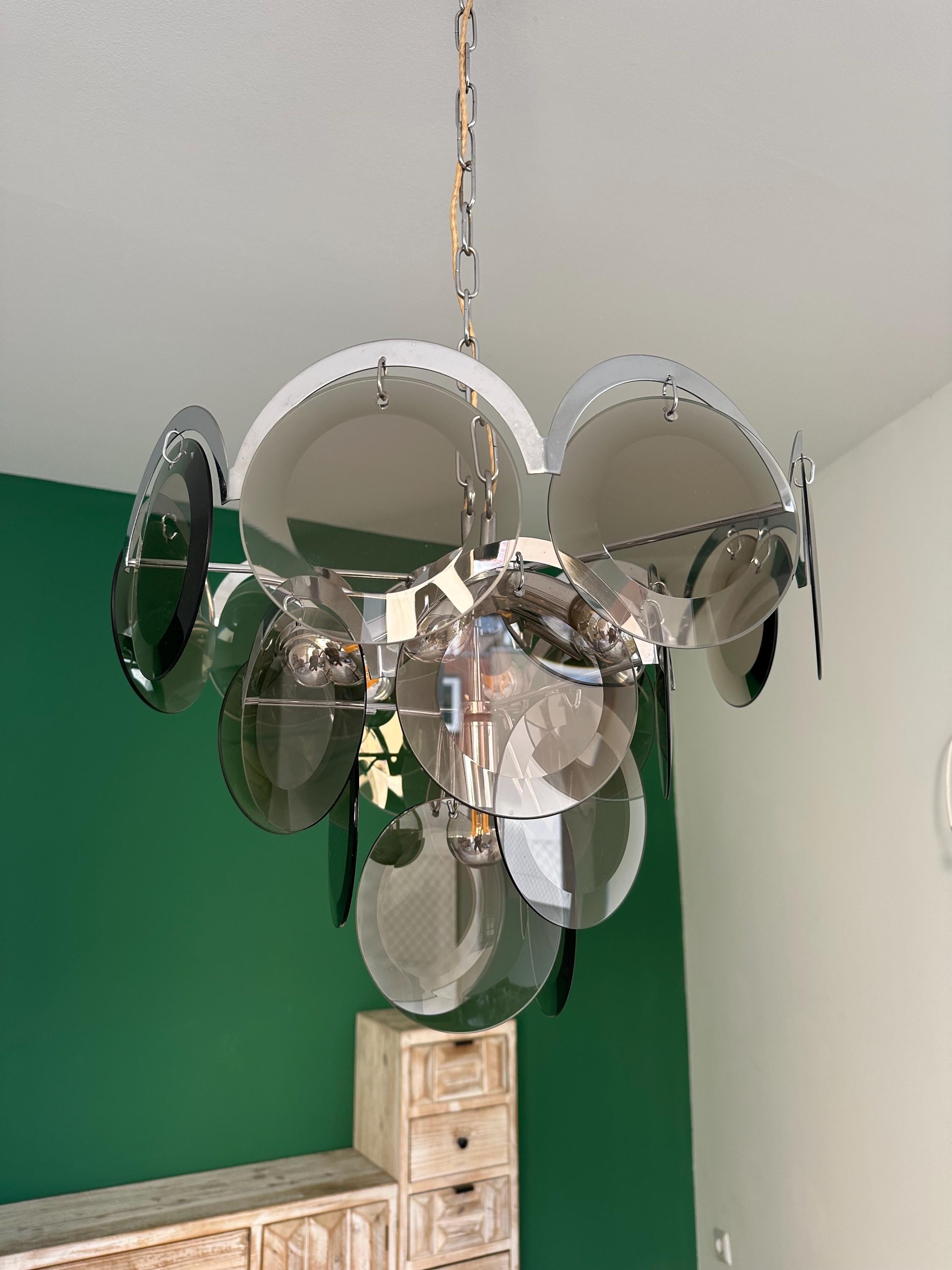 Lampadario vintage in vetro fumé cromato a disco Vistosi/Luc...