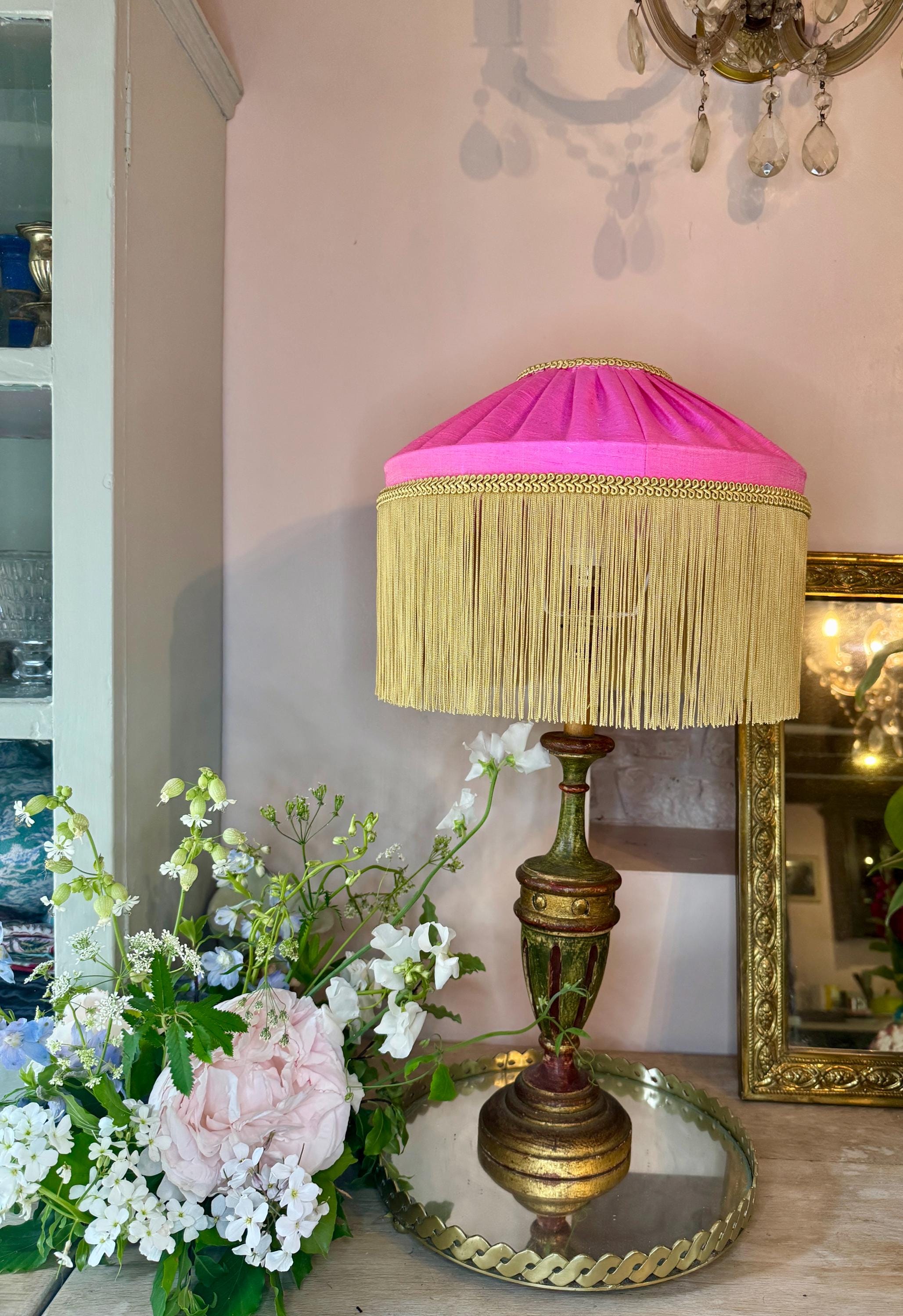 "Paralume in seta rosa acceso fatto a mano con frange e treccia color oro pallido Aggiungi un t...