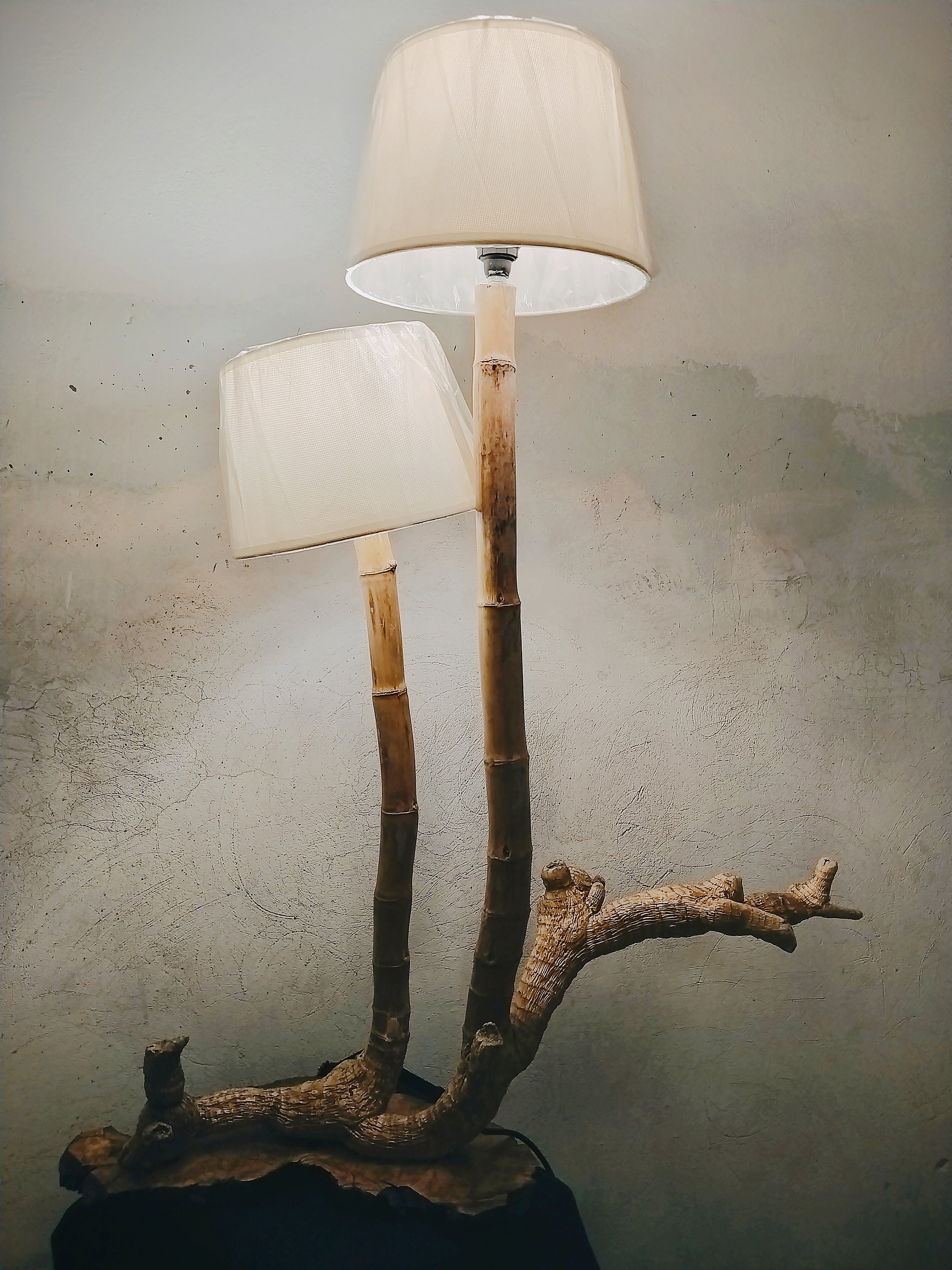 Lampada da tavolo realizzata a mano in legno di radice di bambù. Bambù galleggiante tr...