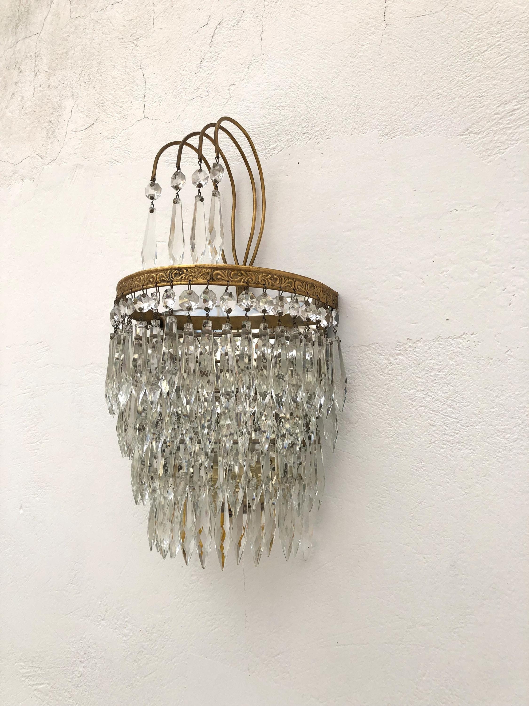 Coppia di applique da parete curve in ottone color metà secolo con circa 90 cristalli ciascun...