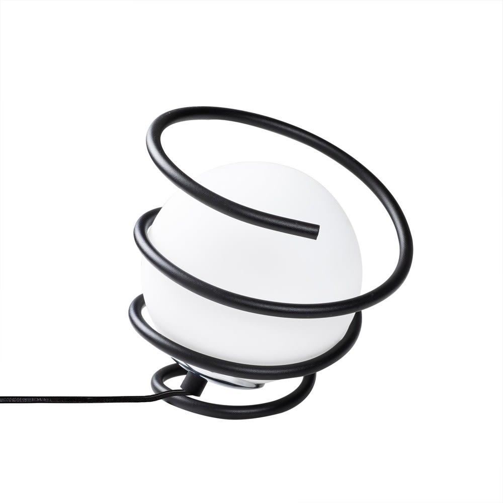 Lampada da tavolo a sfera in vetro contornata da una spirale nera