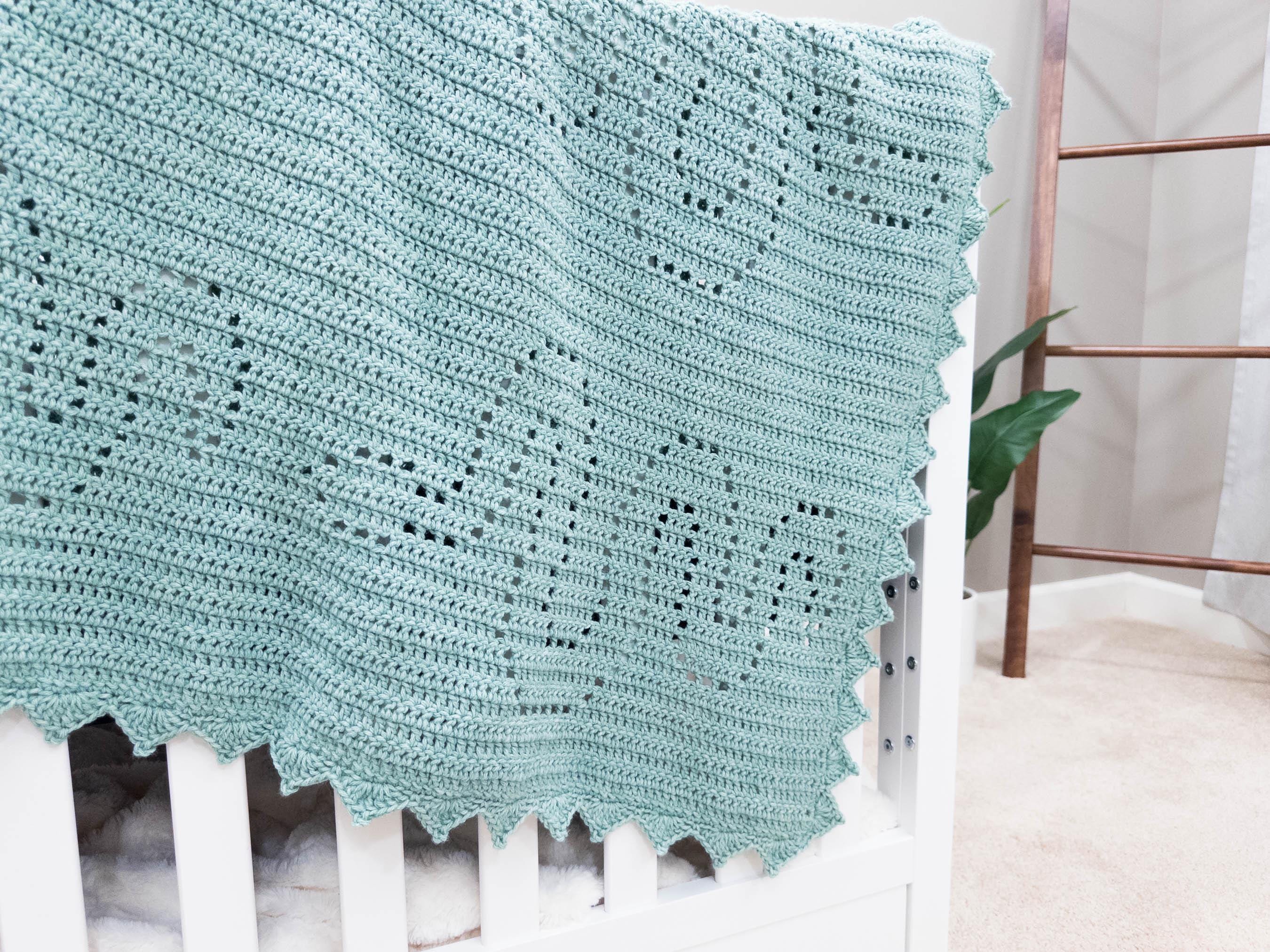 "Il modello per la copertina Beckett, una copertina per neonati all'uncinetto a filet con un gr...