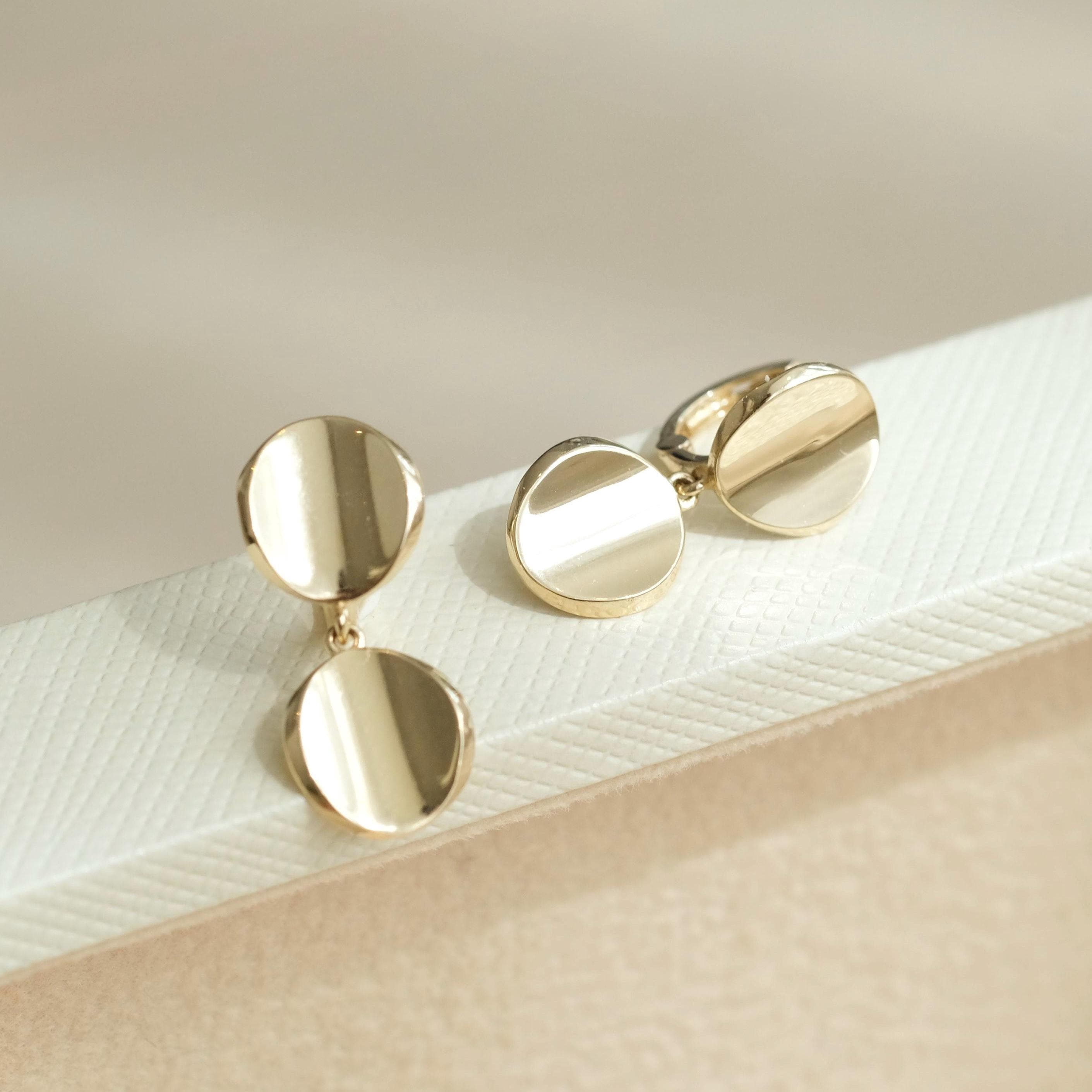 Orecchini a disco in oro massiccio 14K, orecchini a doppio disco ro...