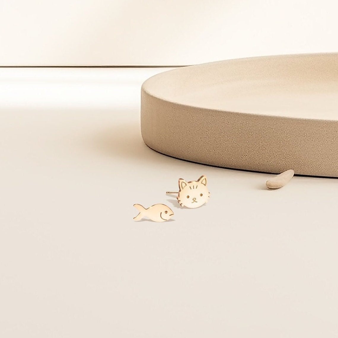 Orecchini a forma di gatto e pesce spaiati, orecchini a bottone del...