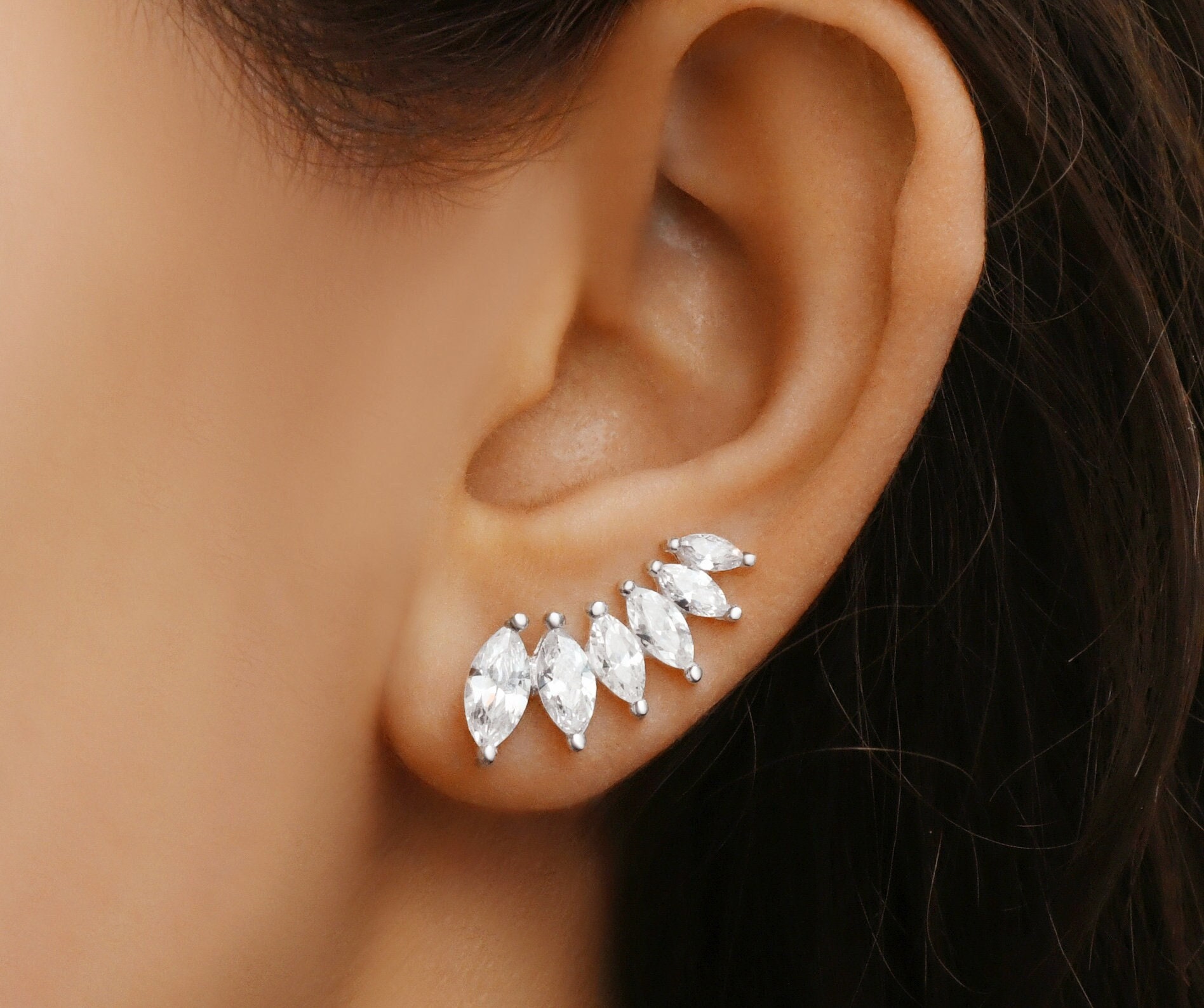 White Marquise Crystal Ear Climbers, Orecchini in Argento Sterling,...