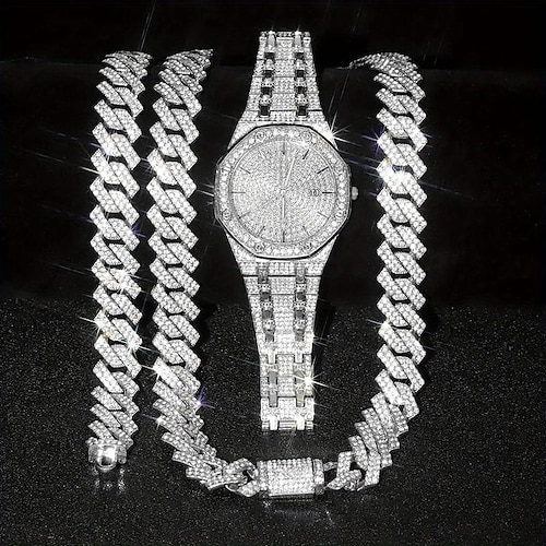 Set di orologio collana bracciale HipHop da uomo 3 pz/set regalo di...