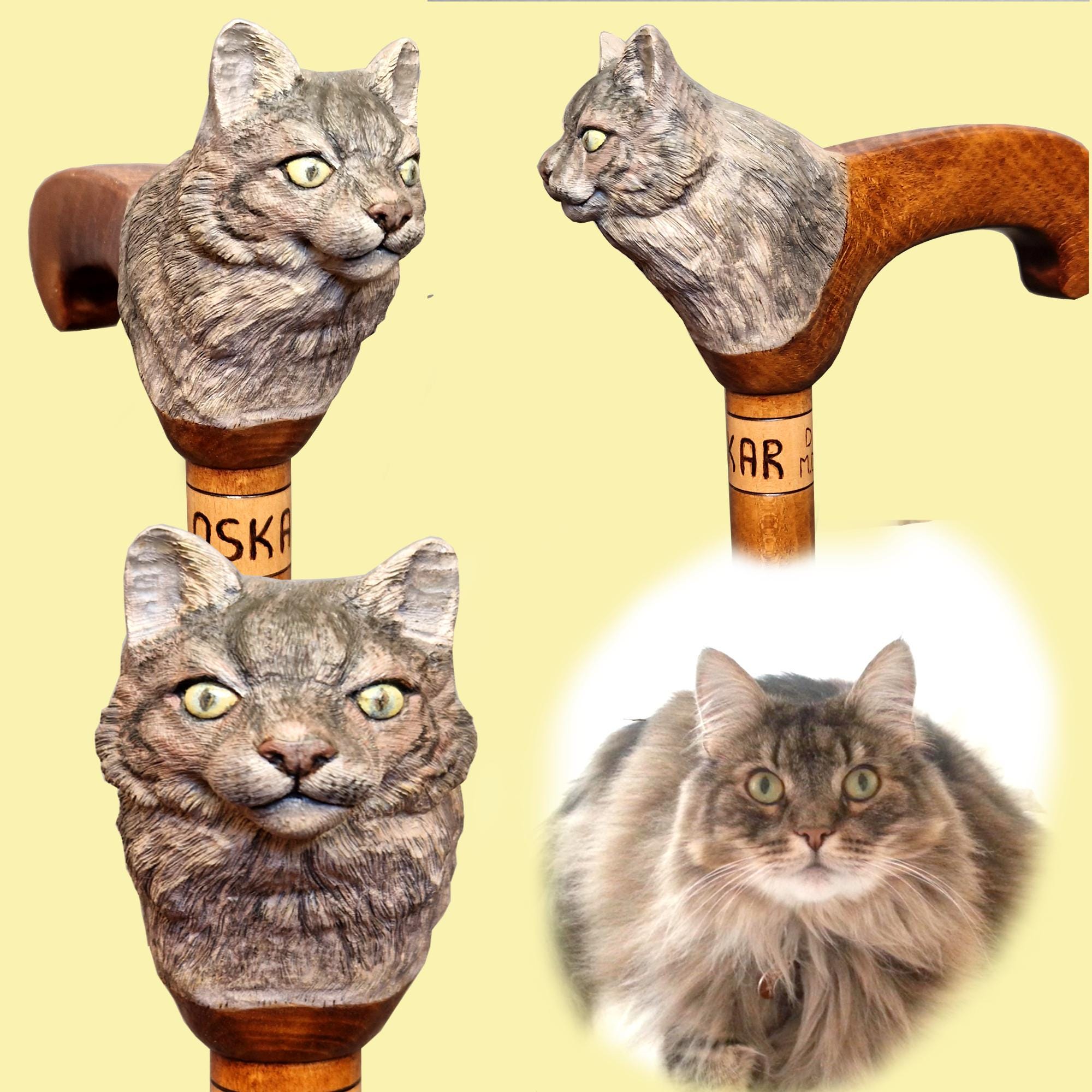 Carved walking sticks and canes Cat head portrait custom painting f...