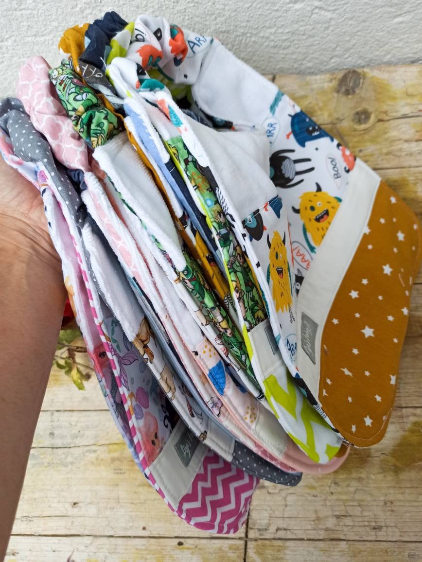 Bavaglia pappa con elastico, in doppio cotone e spugna. Un lato è in tessuto unico, l'altra i...