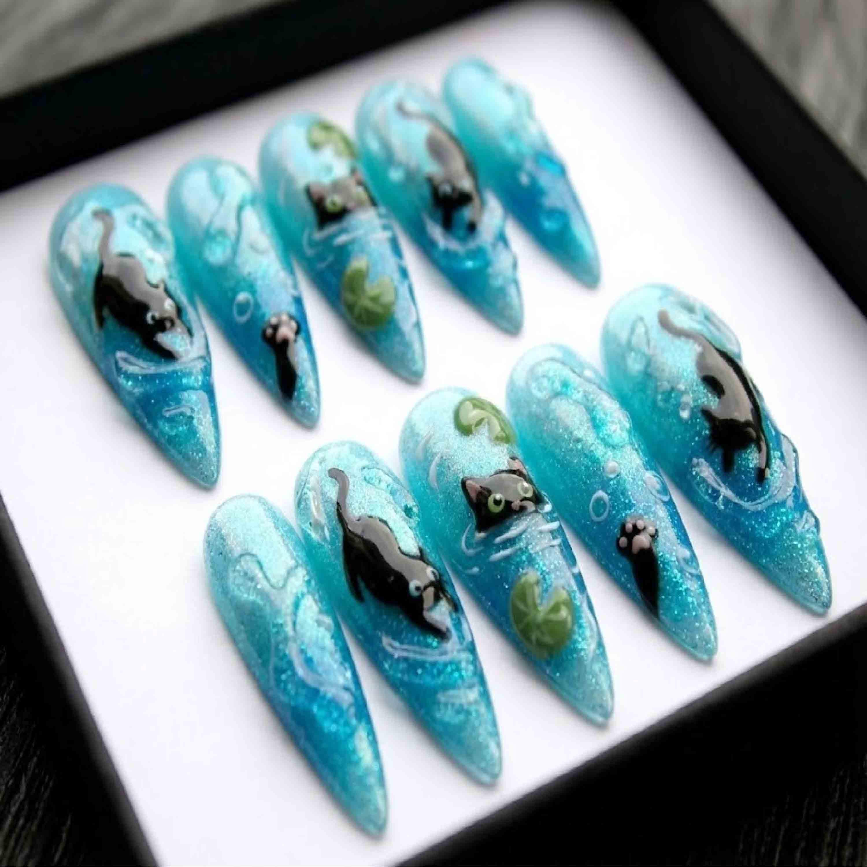 Handmade Swimming Cat Press On Nails | 3D Water Ripples & Blue Glitter | Long Stiletto For Whims...