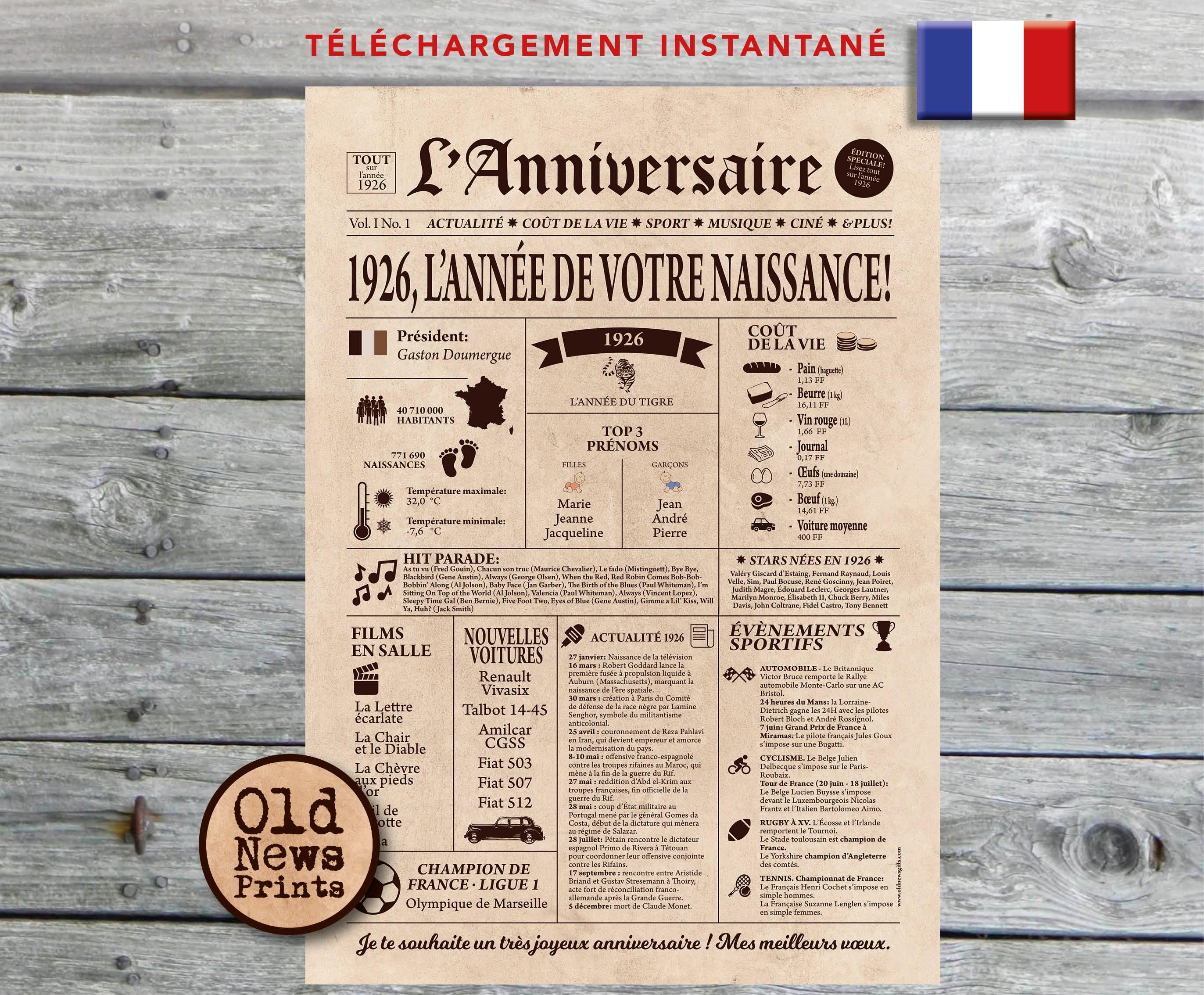 Affiche de journal d'anniversaire pour les 99 ans avec des vraies données de 1926. Elle fera ...
