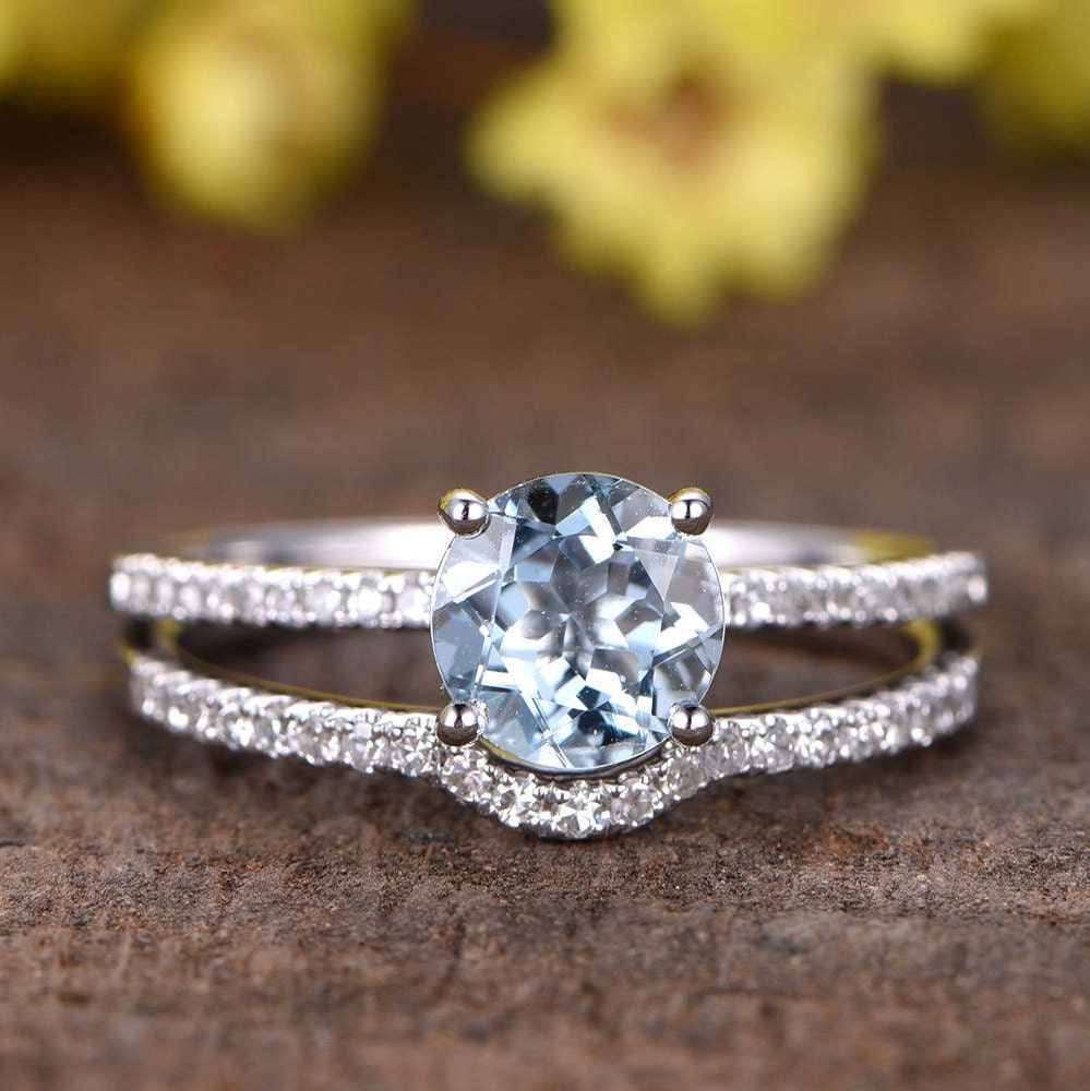 • 1.0 carati Blu Acquamarina Anello Set Acquamarina Anello di fidanza...