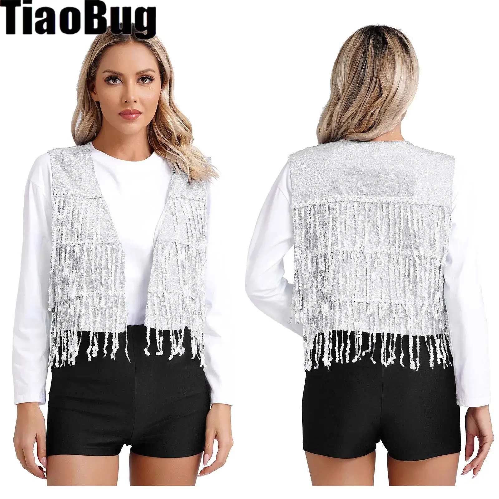 Gilet da ballo con nappe di paillettes lucido da donna gilet senza maniche con Glitter gilet aperto ...