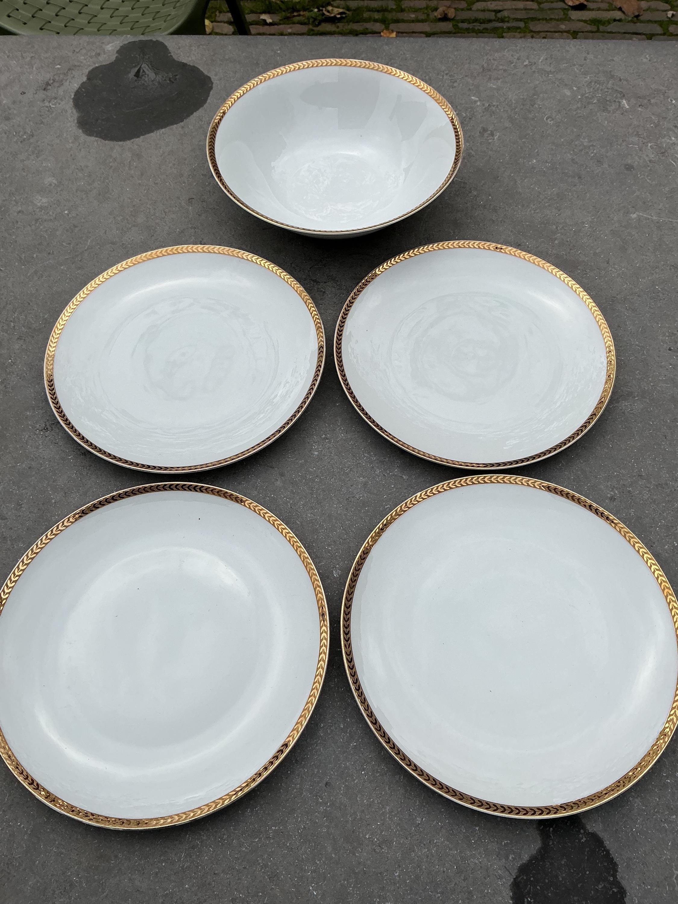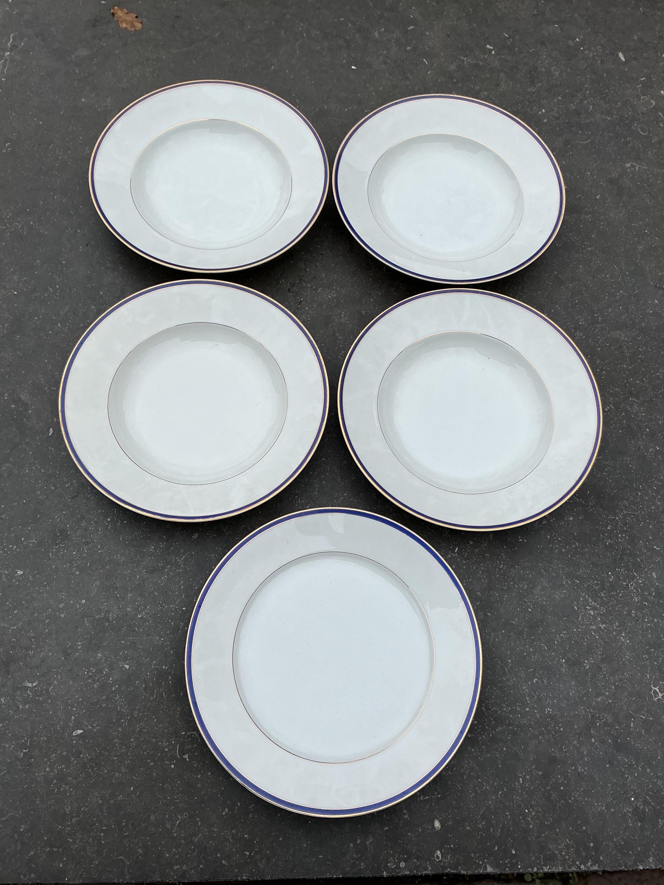 KPM bianco con blu e oro, set di 4 piatti fondi e un piatto piano.
